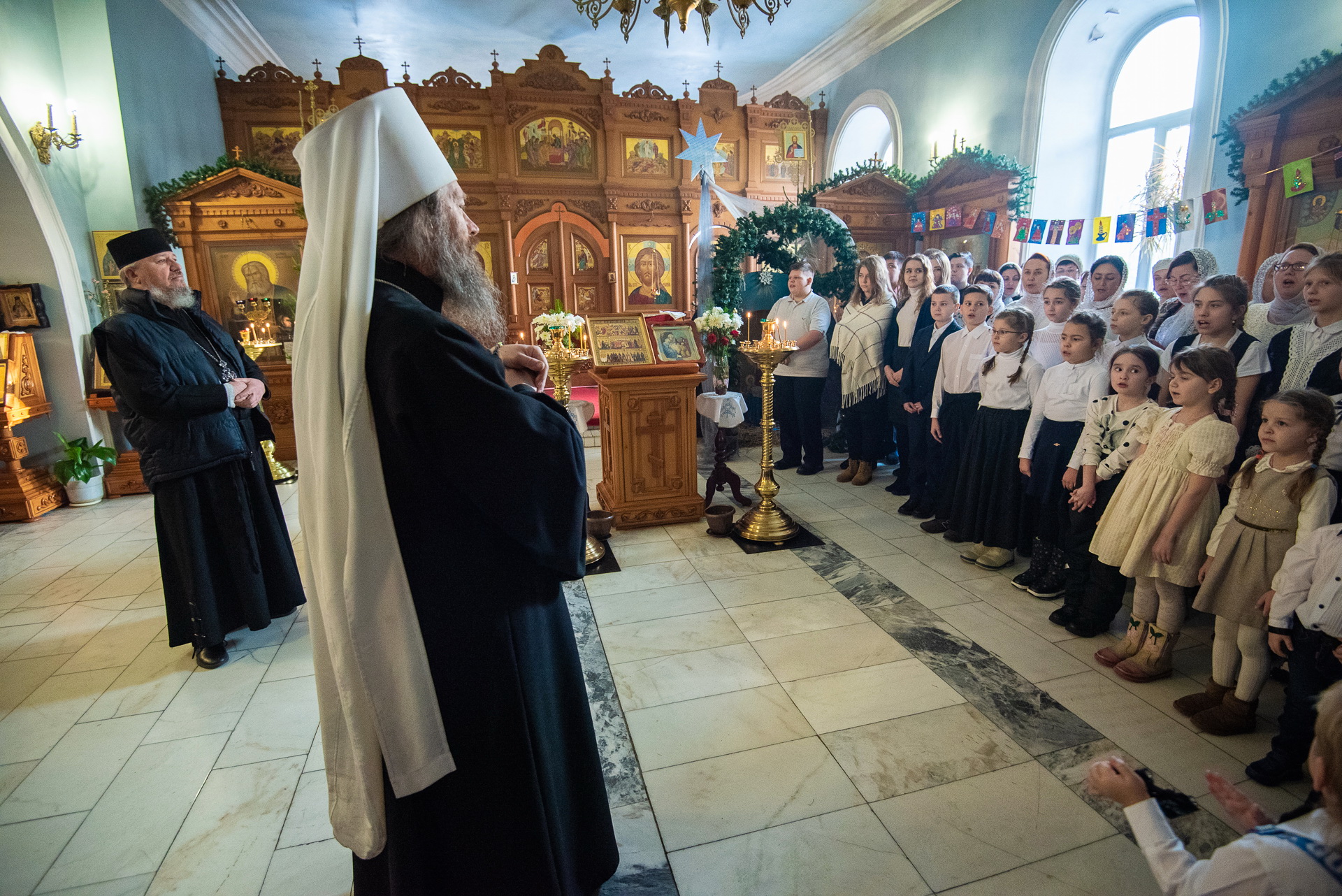 После отпуста литургии Его Высокопреосвященство поздравили с праздником Рождества Христова воспитанники воскресной школы. В южном приделе храма, в красиво оформленном праздничном уголке, ребята исполнили рождественские песнопения. В ответ архипастырь также поздравил детей с Рождеством Христовым и поблагодарил их за «прекрасное пение», отметив, что своим выступлением ребята «присоединились к волхвам» и принесли Младенцу Христу свои дары – этот праздничный концерт.