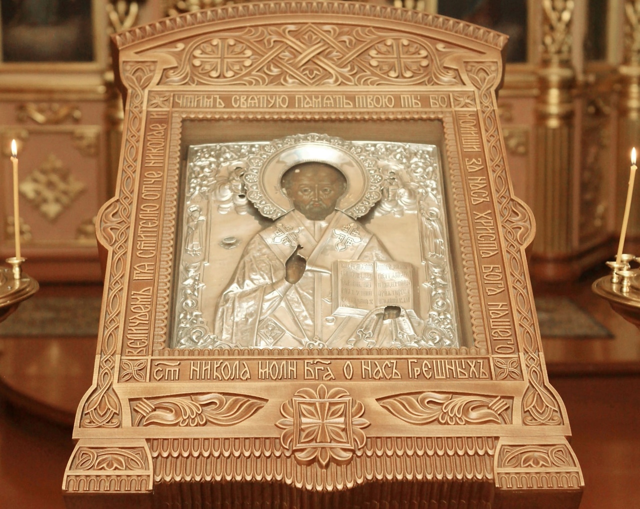 Икона святителя Николая в обожженном резном киоте