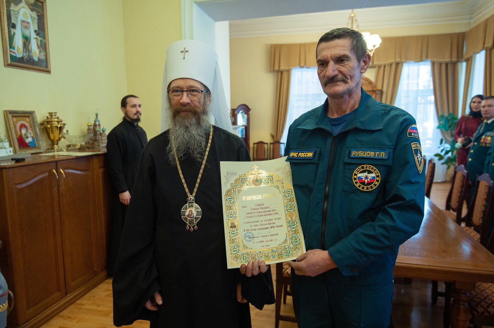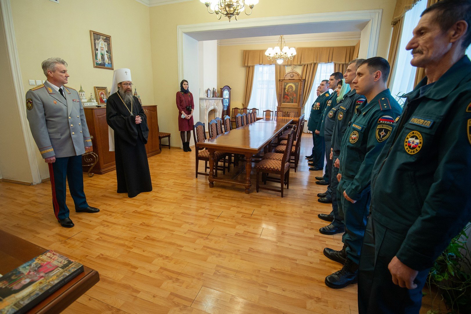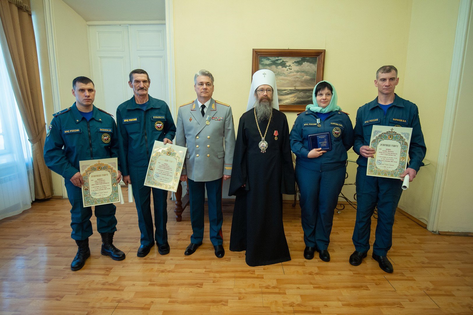 Предваряя награждение, Его Высокопреосвященство поздравил сотрудников ведомства с юбилеем и отметил, что служение Церкви и МЧС во многом похоже.