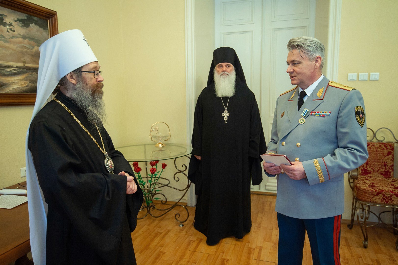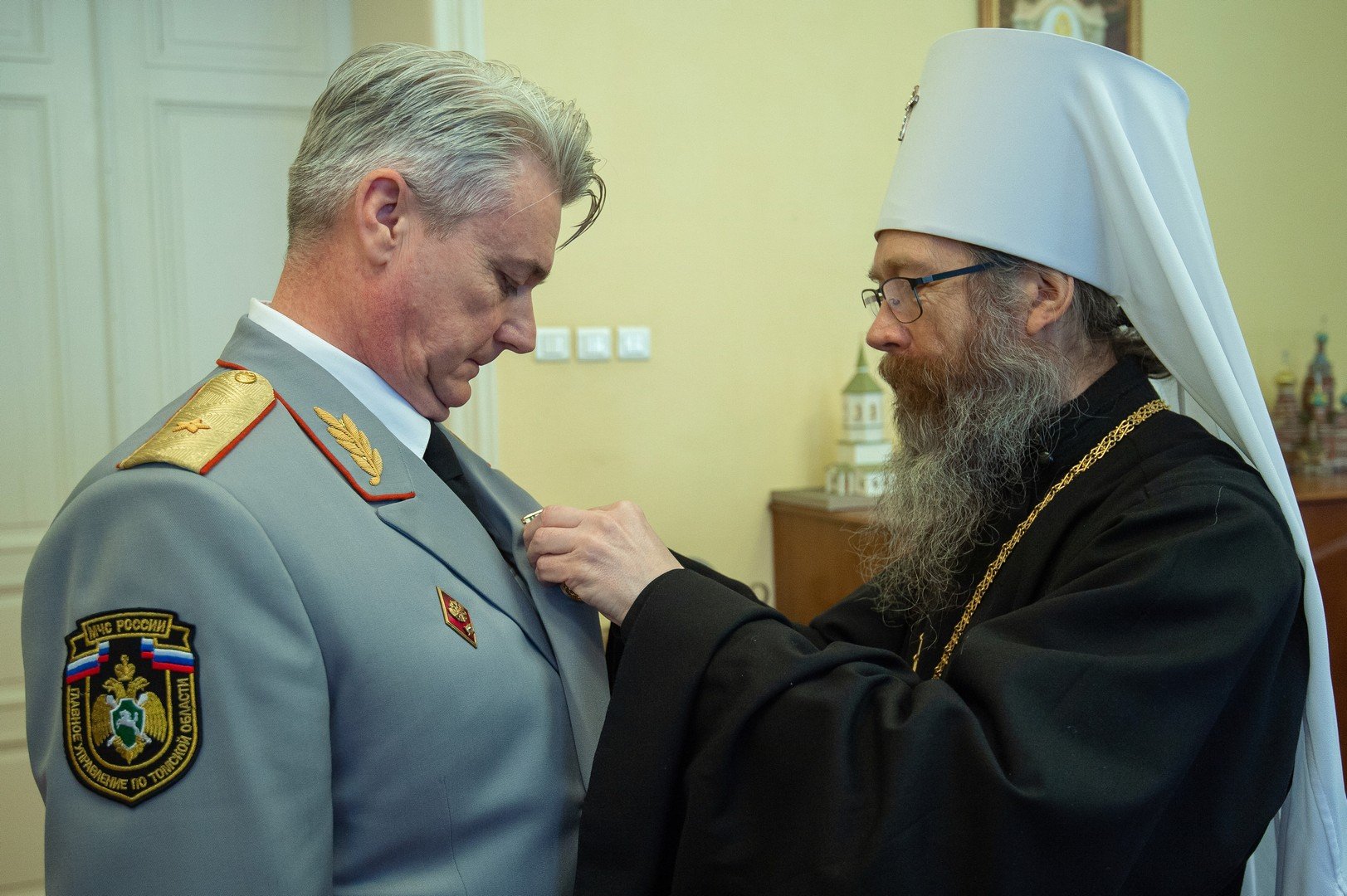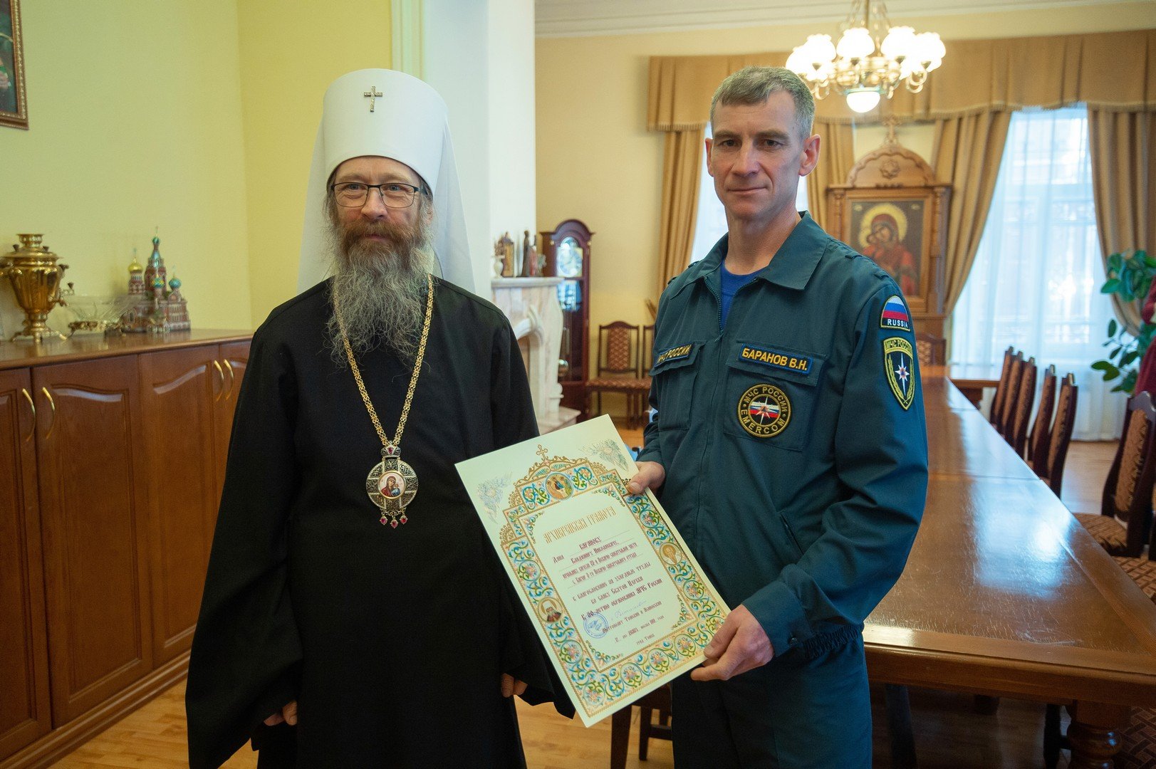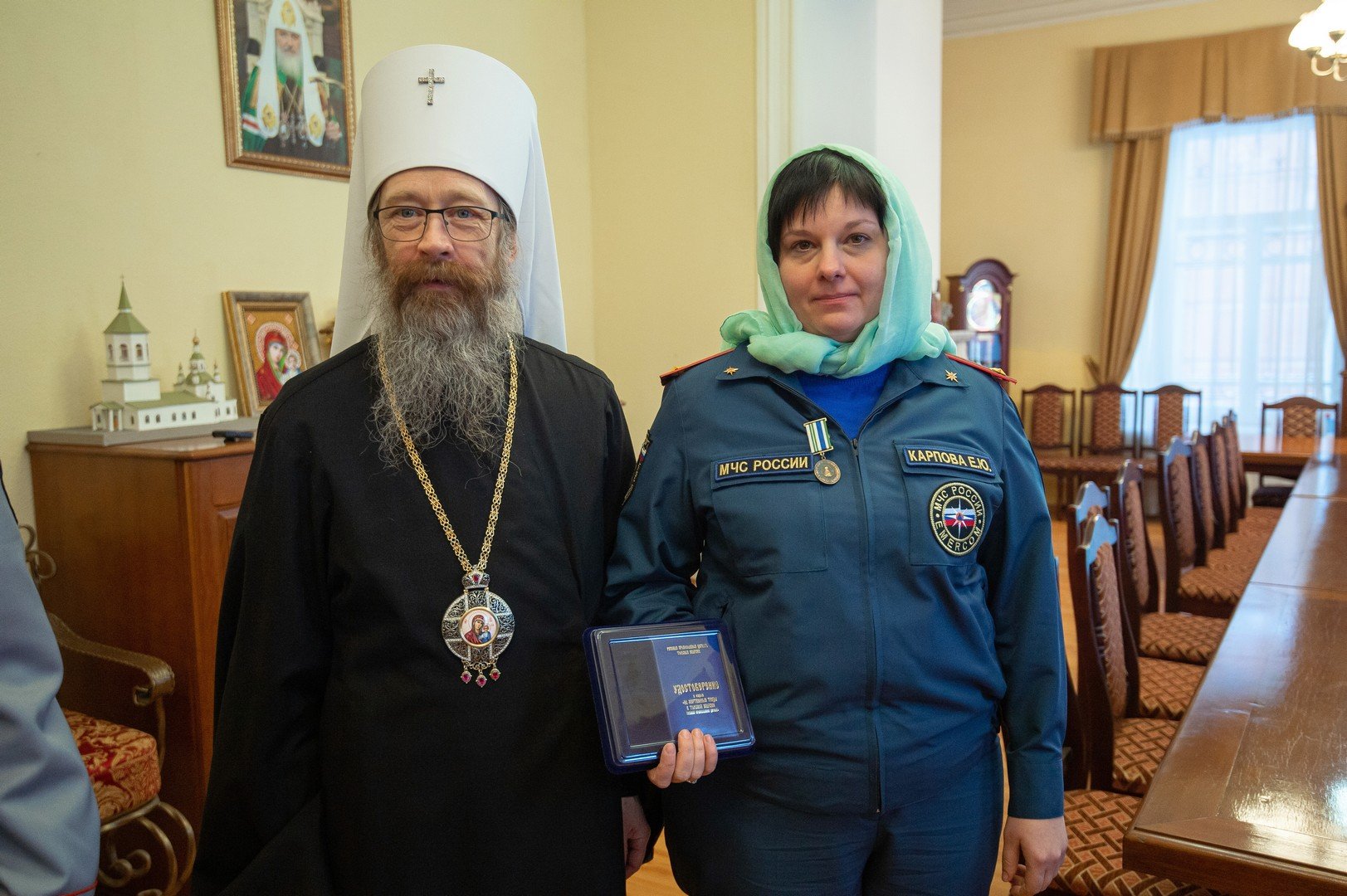 Предваряя награждение, Его Высокопреосвященство поздравил сотрудников ведомства с юбилеем и отметил, что служение Церкви и МЧС во многом похоже.