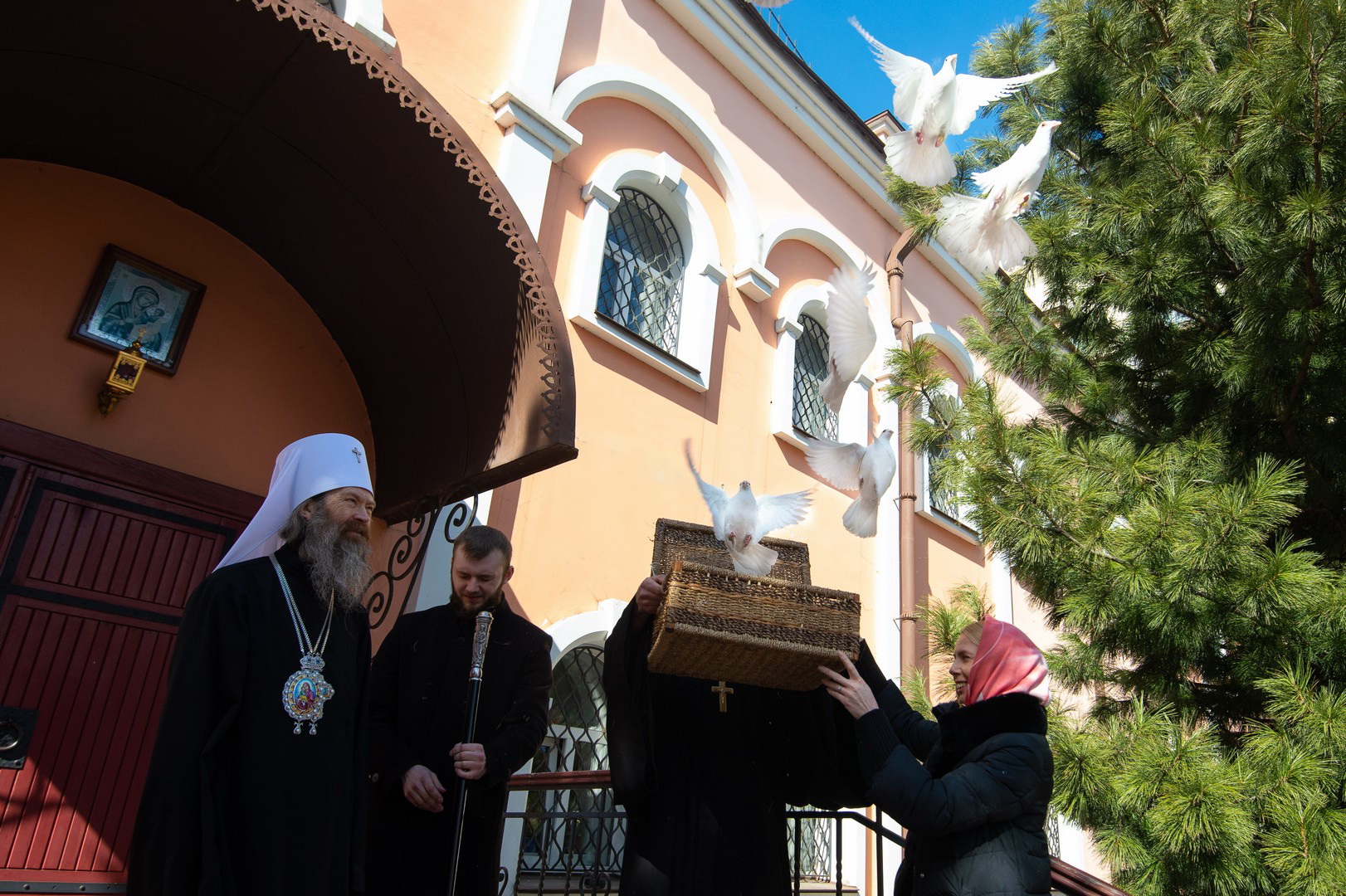 После окончания Литургии духовенство и прихожане вместе со своим архипастырем собрались на площади перед собором, где по традиции выпустили в небо белых голубей.