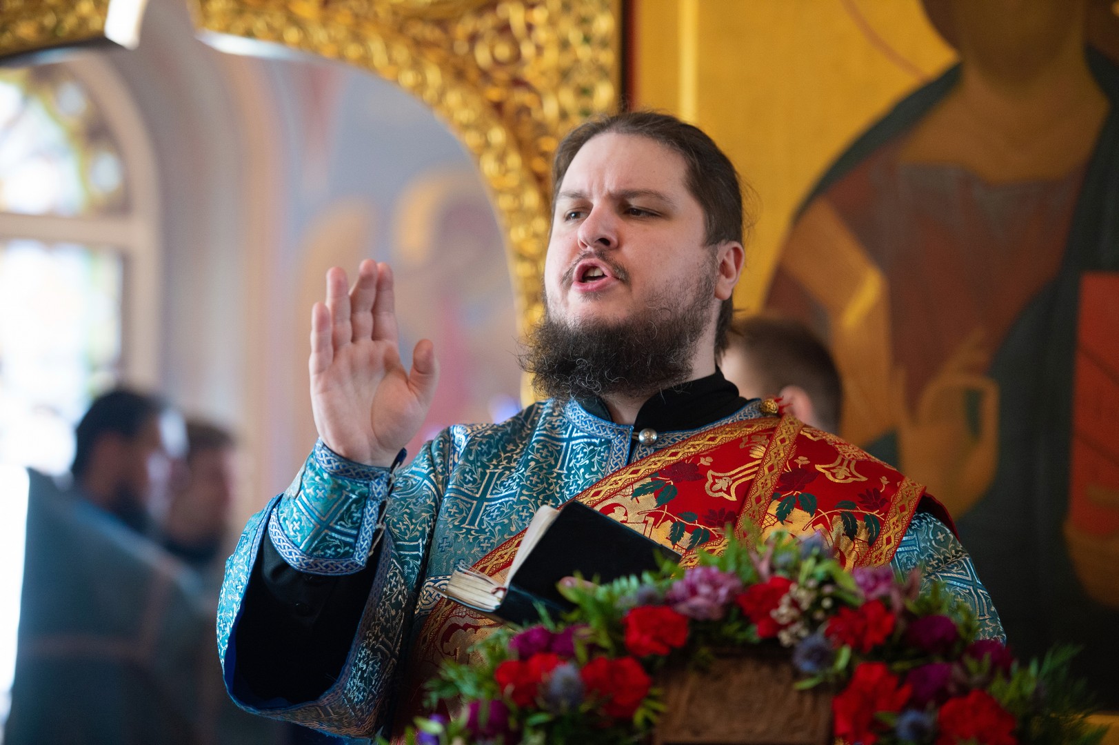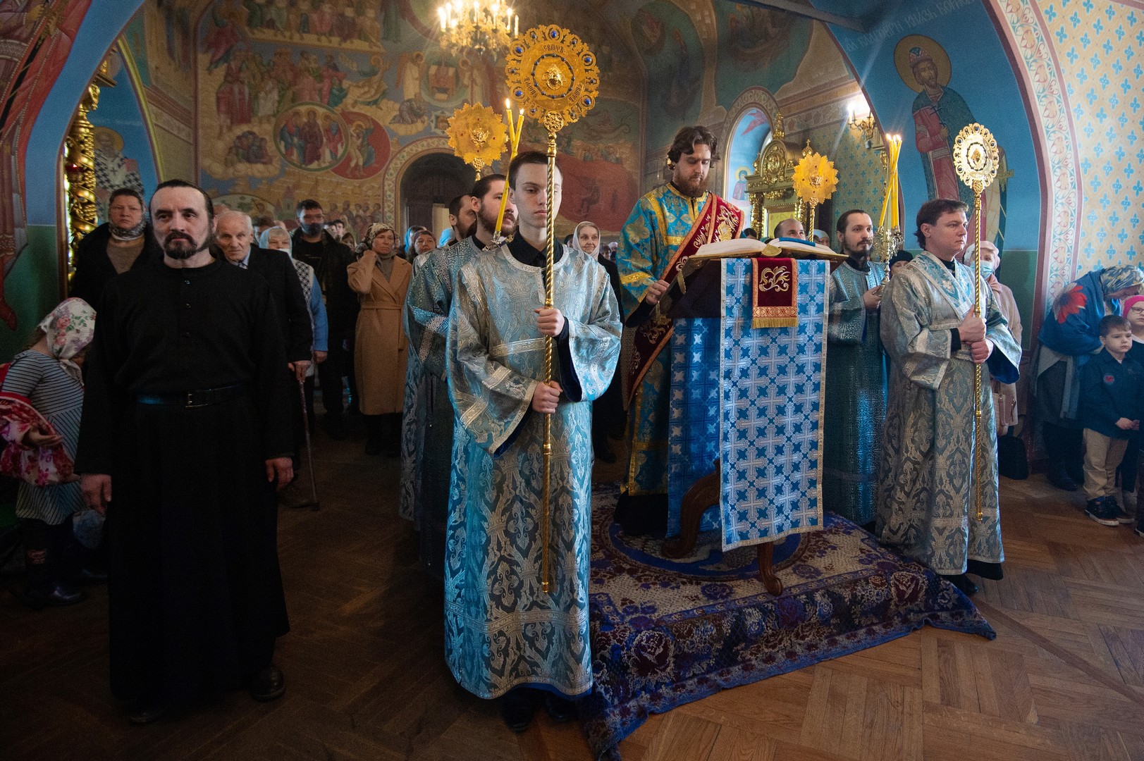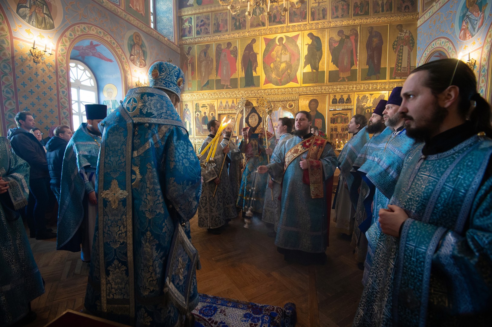 В этом году праздник Благовещения пришелся на среду Крестопоклонной недели Великого поста. Ввиду важности празднуемого события богослужебный устав установил служить полную Литургию, а не Литургию Преждеосвященных Даров, которую положено совершать по средам и пятницам Великого поста. Особую торжественность праздничному богослужению придают в этот день облачения священнослужителей – черные великопостные заменены на голубые Богородичные.