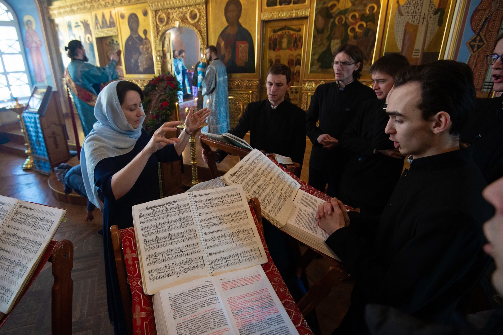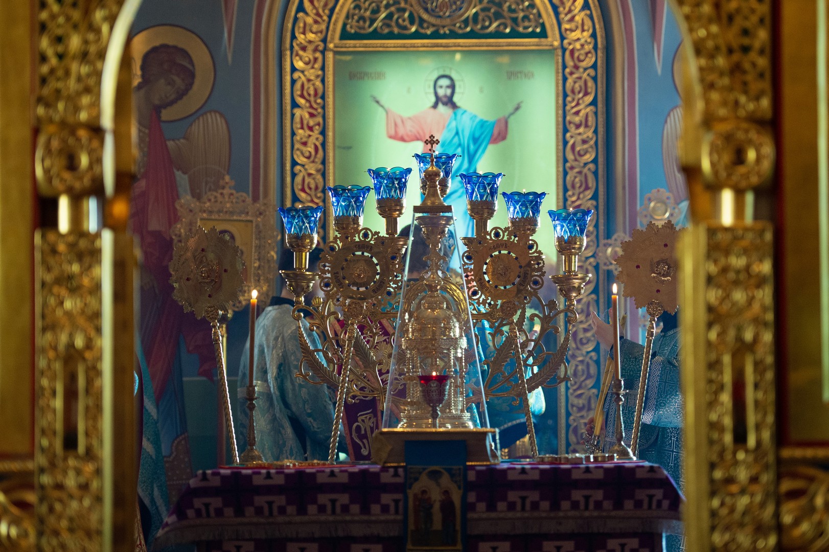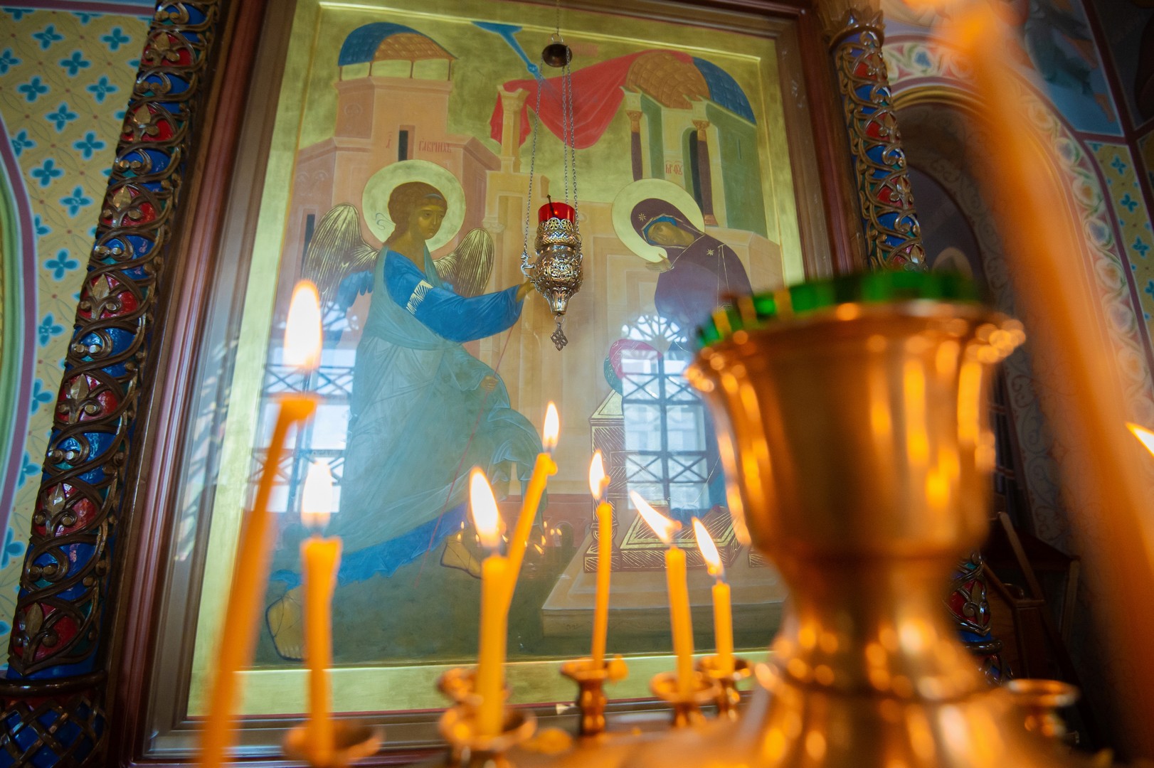 В этом году праздник Благовещения пришелся на среду Крестопоклонной недели Великого поста. Ввиду важности празднуемого события богослужебный устав установил служить полную Литургию, а не Литургию Преждеосвященных Даров, которую положено совершать по средам и пятницам Великого поста. Особую торжественность праздничному богослужению придают в этот день облачения священнослужителей – черные великопостные заменены на голубые Богородичные.