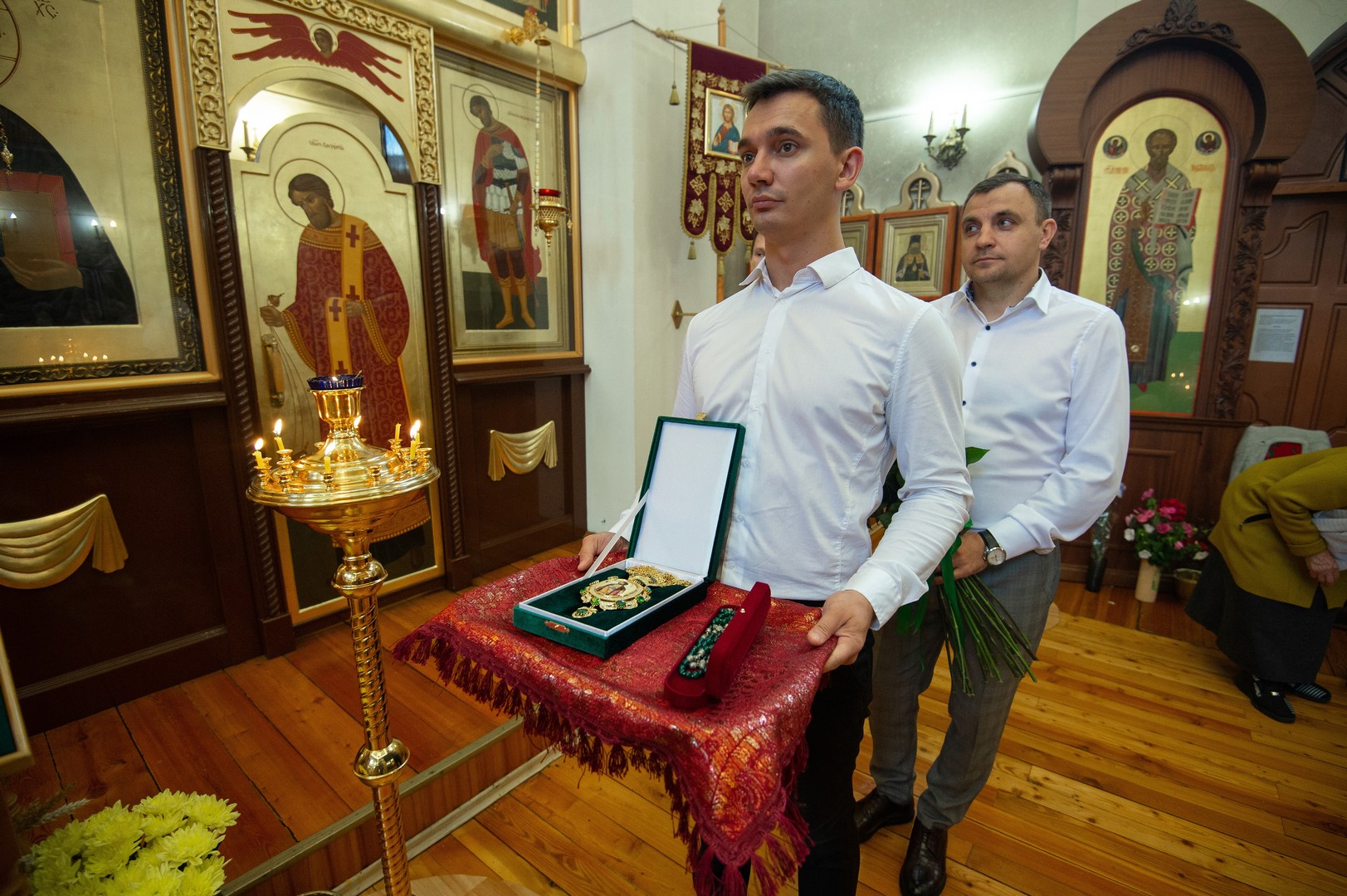 Также Юрий Михайлович подарил настоятелю храма иерею Олегу Бугакову комплект пасхального иерейского облачения.