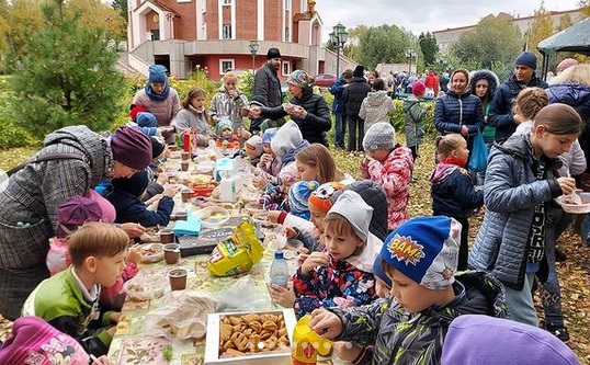 После Литургии и молебна ученики воскресной школы Владимирского храма по традиции собрались на прихрамовой территории на праздничный пикник, в рамках которого для родителей было организовано родительское собрание, а дети приняли участие в веселых стартах.