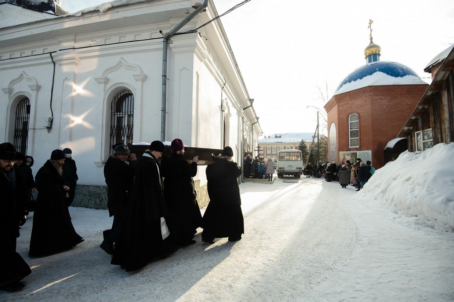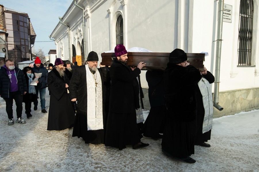 После отпевания гроб с телом почившего пронесли крестным ходом вокруг храма, сопровождавшийся таким же перезвоном колоколов, как и при выносе Плащаницы в Великую Субботу.