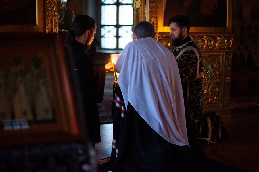 После пения великого прокимна и закрытия Царских врат духовенство переоблачилось в великопостные черные ризы. После отпуста вечерни глава Томской митрополии прочитал молитвы на начало Великого Поста.