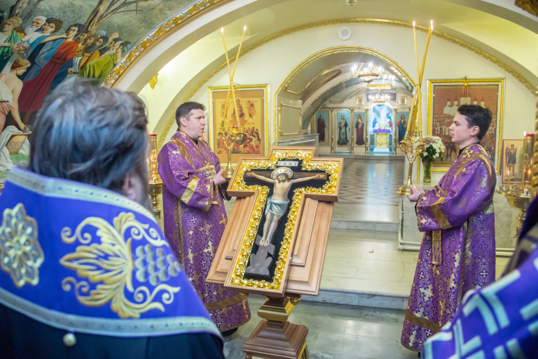 Священнослужители торжественно перенесли святыню в верхний храм, после чего было совершено Всенощное бдение. За богослужением, согласно богослужебному уставу, состоялся вынос креста и чин воздвижения.
