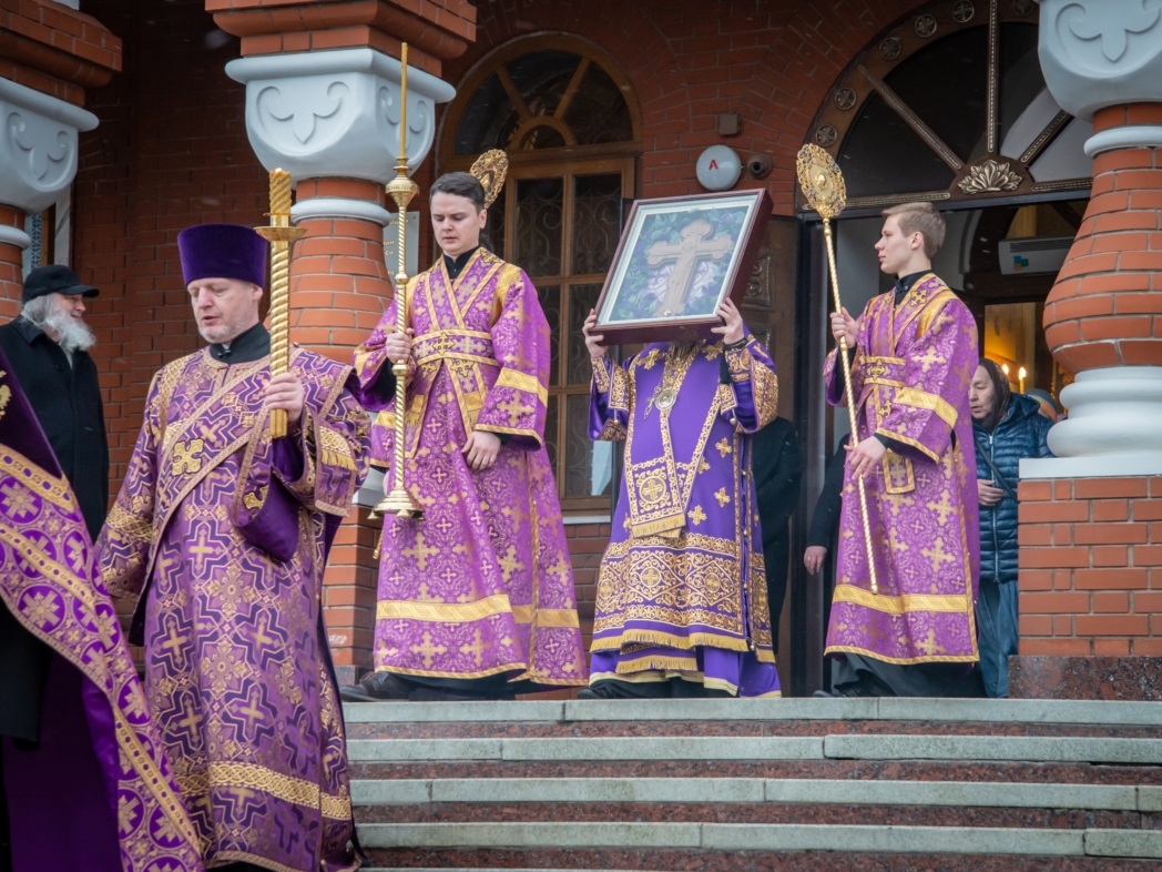 Накануне вечером архипастырь молился за Всенощным бдением, совершил вынос креста и крестный ход вокруг храма.