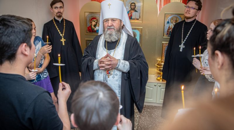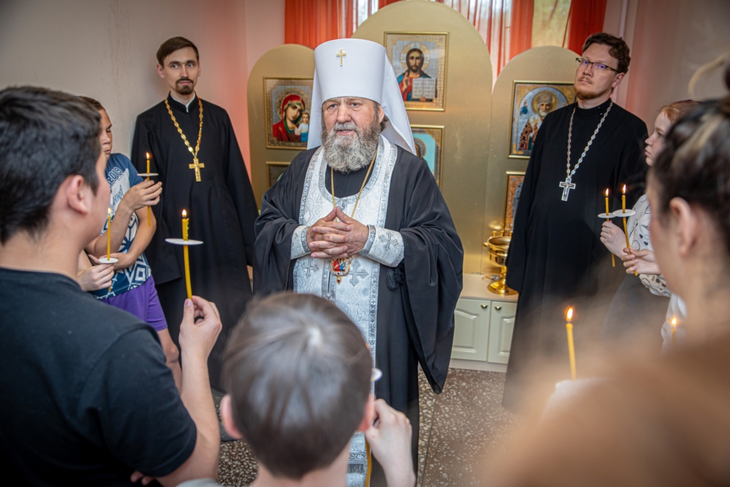 После богослужения владыка поздравил всех с этим памятным днем — открытием молитвенной комнаты в честь святых Кирилла и Мефодия, совершаемым накануне дня памяти святых, рассказал о том, почему Церковь так чтит этих братьев, а также поблагодарил всех причастных к благоустроению этой молитвенной комнаты.
