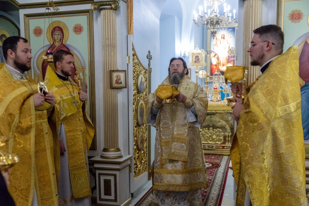 Правящему архиерею сослужили настоятель собора иерей Сергий Чукавин, настоятель храма Серафима Саровского г. Сарапула протоиерей Вячеслав Остроумов и ключарь Воскресенского храма иерей Иоанн Абрамчик г. Сарапула.