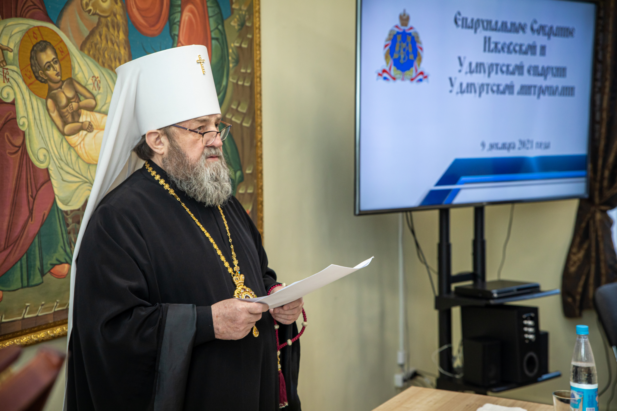 Заседание началось с отчетного доклада управляющего епархией. Владыка рассказал о текущем положении дел в Ижевской епархии и информировал о предстоящих важных мероприятиях: о соревнованиях Межконфессиональной спартакиады 2022 года и очередных Парламентских Рождественских чтениях, которые пройдут 17 декабря в Госсовете Удмуртии.