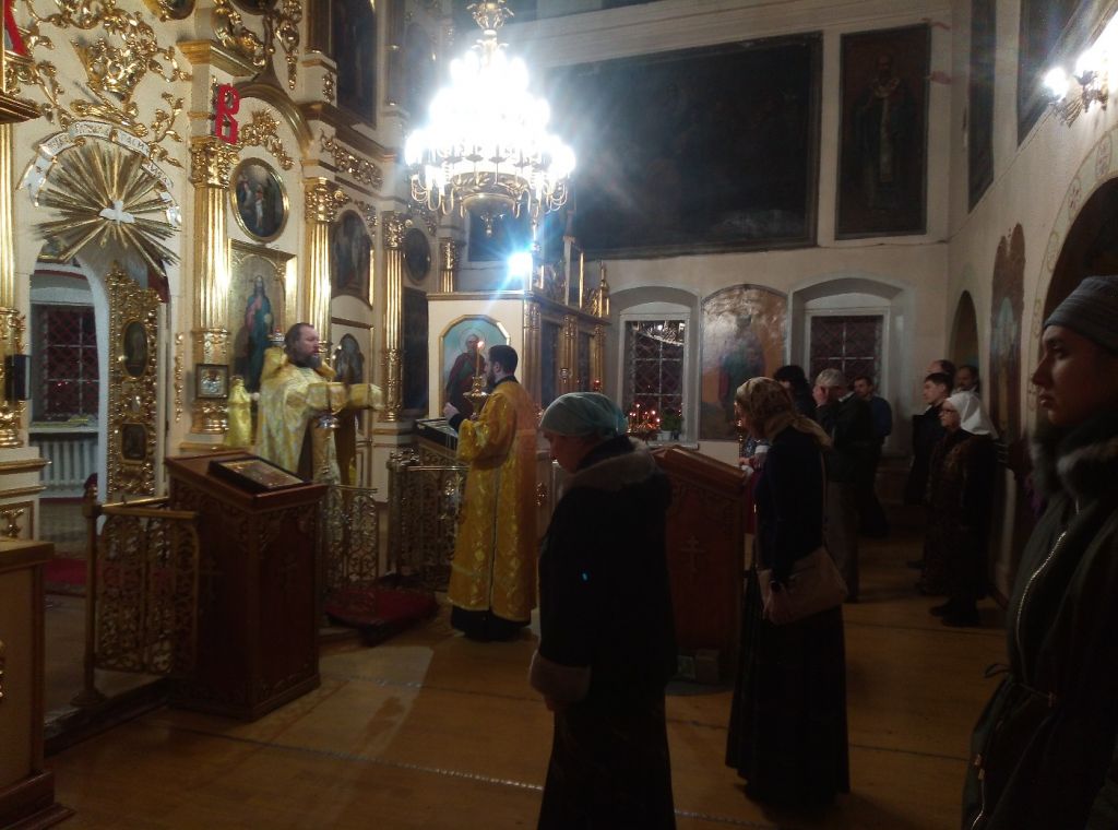 В этом что-то есть, когда вокруг Божьего храма со всех сторон взрываются петарды, разноцветные вспышки как будто пытаются оторвать внимание христианина от молитвы, но все это не мешает устремляться сердцу молящегося к его Создателю. И в этом разговоре слышится предвкушение иной, ещё не наступившей, но уже такой близкой Рождественской радости! На службе было более 30 человек, это в основном сестры милосердия, молодежь и прихожане нашего храма. Причащались почти все. Богослужение возглавил настоятель храма протоиерей Александр Данилов.