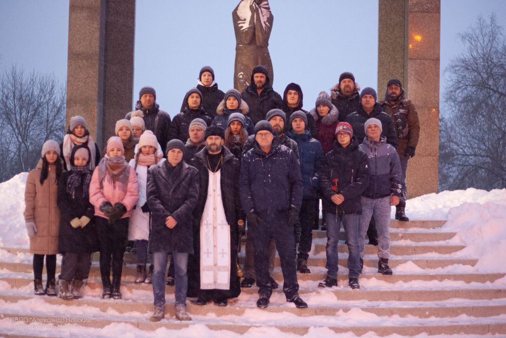Перед началом акции участники расчистили от снега памятные плиты и площадку перед памятником «Скорбящая мать», а затем, в память о погибших воинах, была отслужена заупокойная лития.
