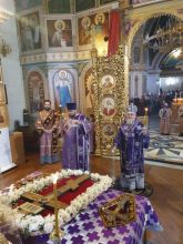 Владыка совершил помазание верующих св.елеем от лампады, горящей перед вынесенным Крестом.
