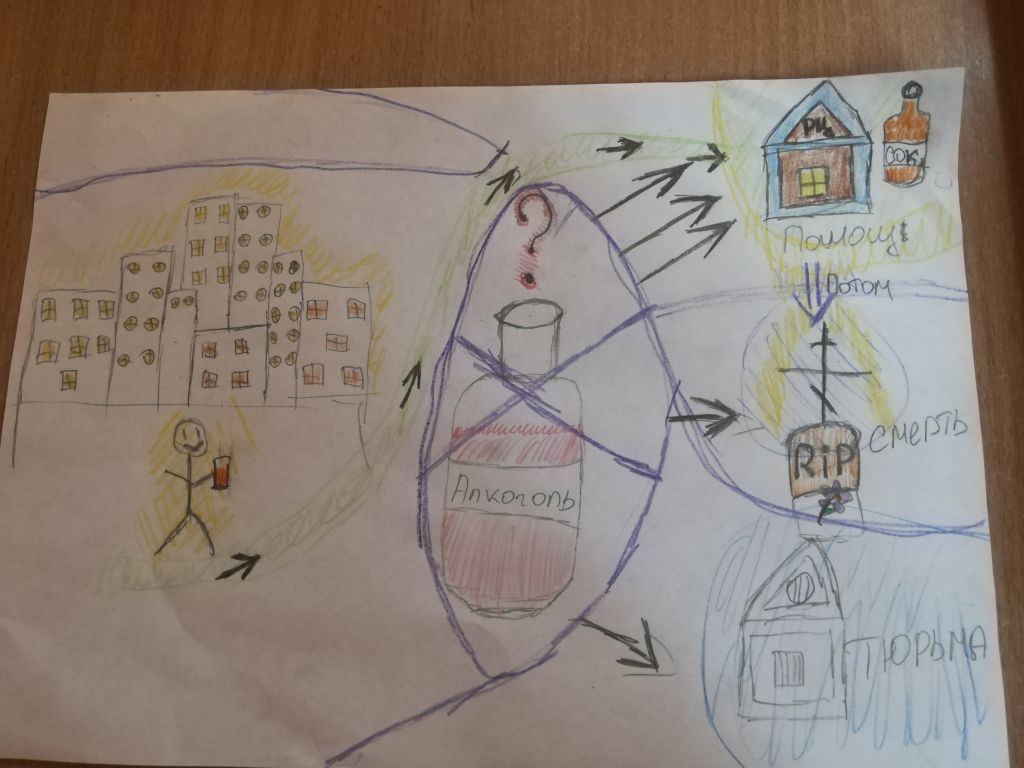 Вторая часть проходила в формате «арт-терапии». Ребята рисовали себя и свою зависимость. Кто-то изобразил себя опутанным в паутине, кто-то в виде виртуального человечка на распутье. Затем переделывали свои негативные рисунки в позитивные. Смысл терапии заключался в самостоятельном поиске воспитанниками «инструментов» выхода из своей зависимости. Отрадно, что среди прочих «инструментов» были отмечены такие, как: «жить ради семьи».