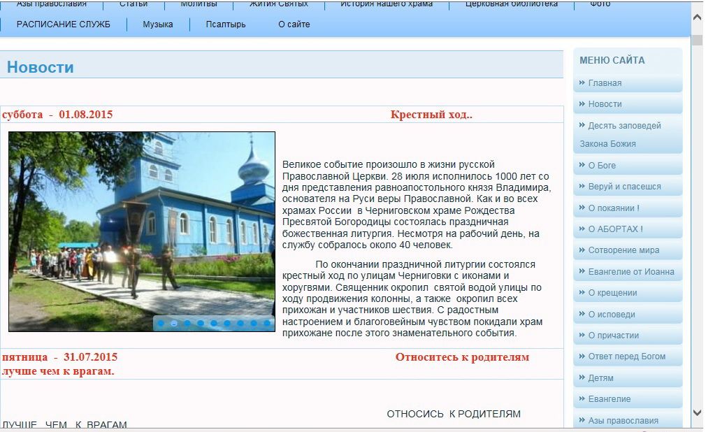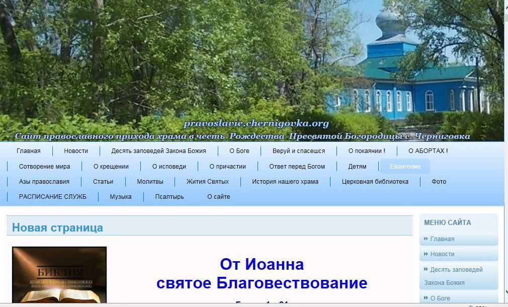 Черниговка. Новый сайт рассказывает о жизни прихода храма Рождества Пресвятой Богородицы села Черниговка. На сайте можно узнать о расписании богослужений, истории храма и новостях прихода. Много материалов для готовящихся ко Крещению, исповеди и Причастию, о Таинствах Церкви, о постах, православной семье, правилах поведения в храме и многом другом. Есть фотоальбом, видеозаписи молитв, акафистов и чтения Псалтири. На сайте можно прочитать Святое Евангелие и избранные труды святых отцов и современную православную литературу. Есть страничка для детей.