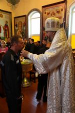 После Крещения состоялось и первое Причастие новых членов тюремной общины. По окончании богослужения епископ Николай поздравил новокрещенных с принятием Святых Божественных Тайн. Таинство Причастия было преподано и осужденным, находящимся в локальном участке колонии СУСе (Строгие условия содержания). После службы каждый из новоначальных христиан получил из рук священников подарок — православный молитвослов.
