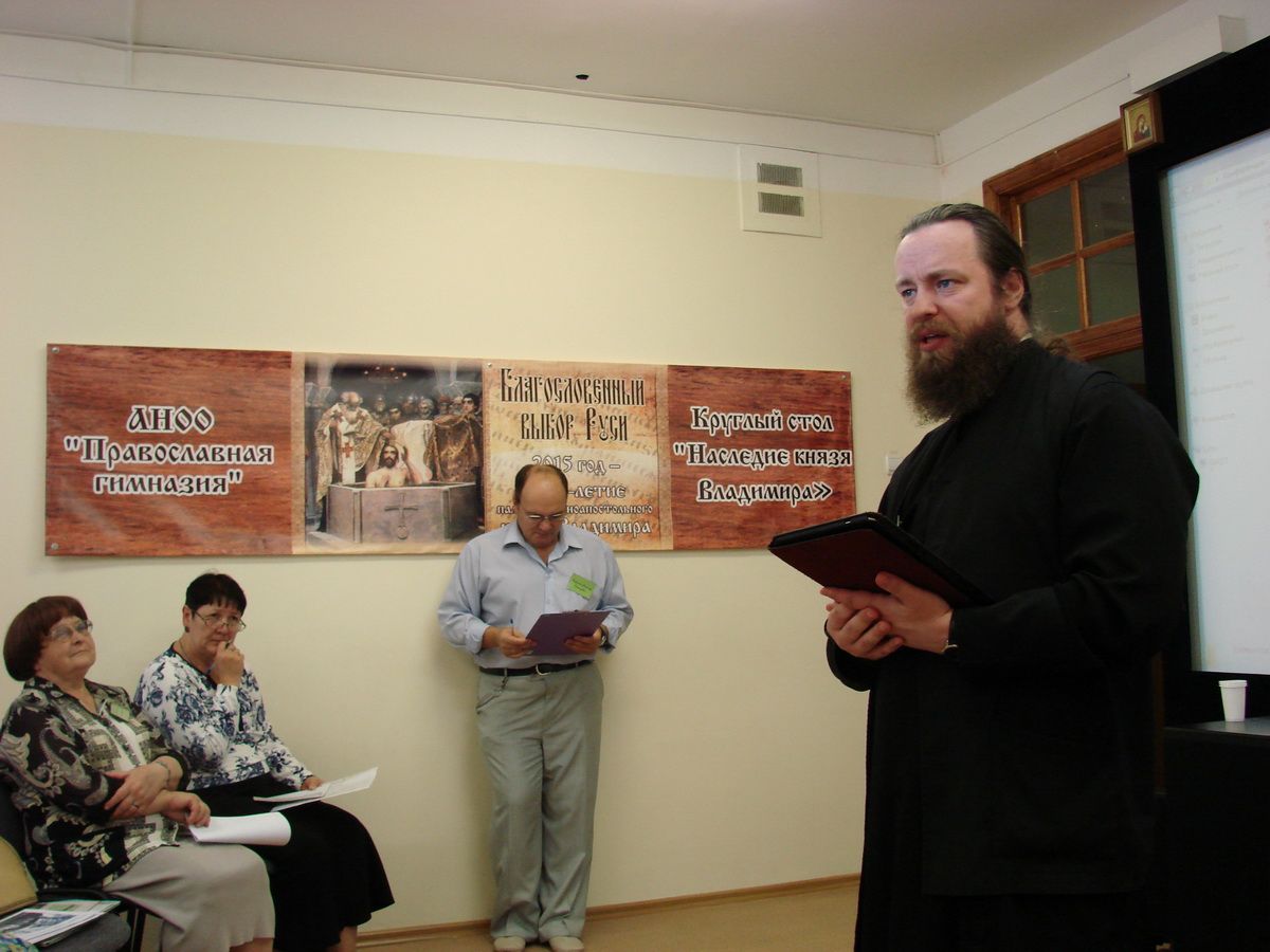 Доклад игумена Никиты (Зеленюка), учителя Основ Православной веры гимназии "Развитие образования и культуры в Древней Руси, благодаря деятельности князя Владимира" вызвал большой интерес и вопросы слушателей.