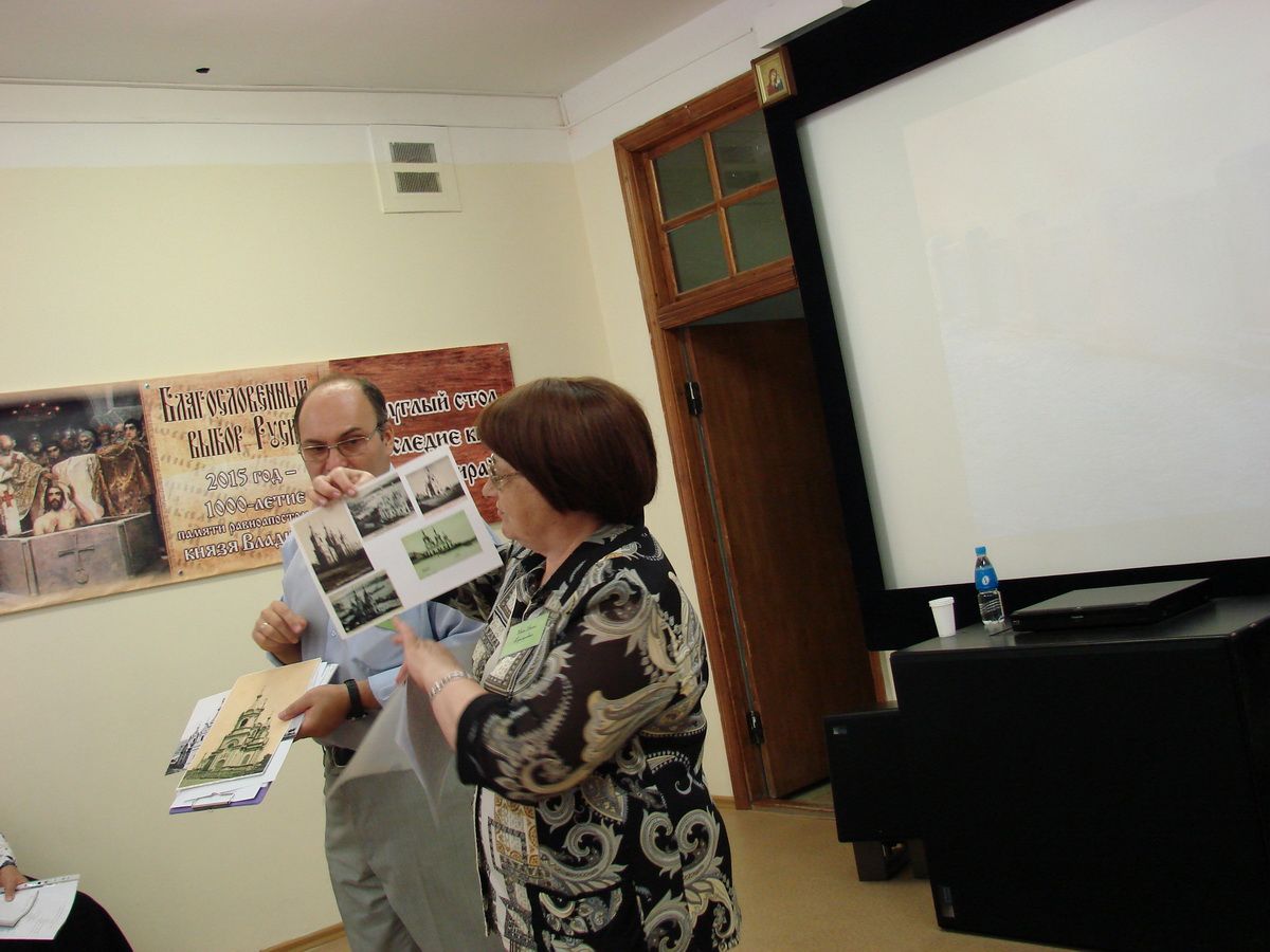 Нелли Григорьевна Мизь, краевед, старший научный сотрудник исторического музея ДВФУ рассказала о связи святого князя Владимира с Приморьем. Эта связь прослеживается в топонимике, и в храмах, посвящённых святому князю. Нелли Григорьевна показала исторические фотографии храмов Приморья.