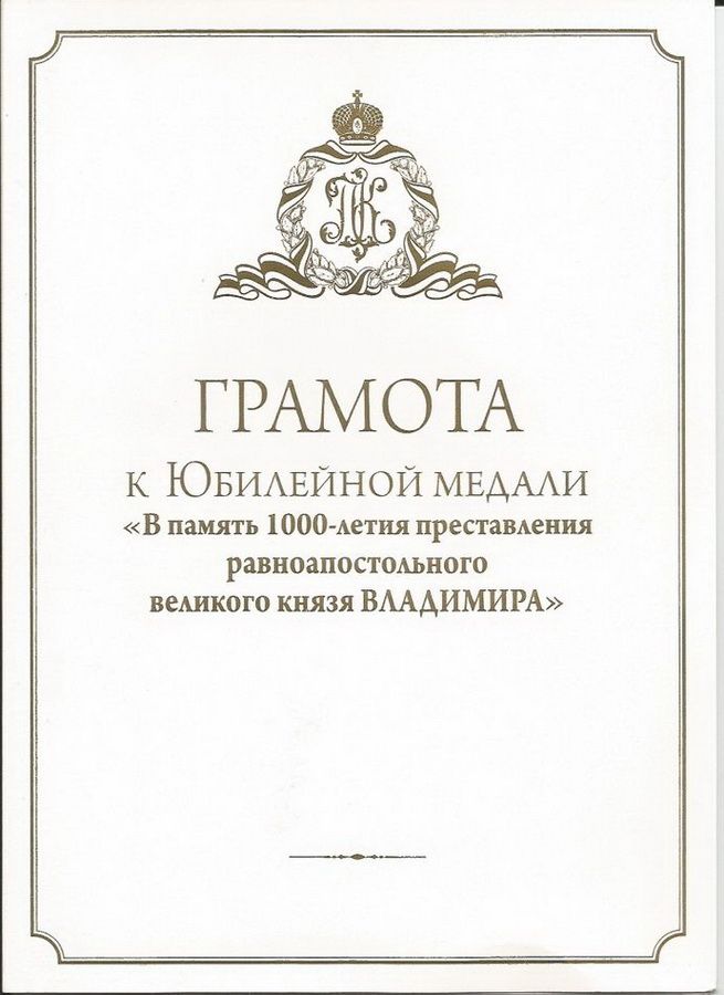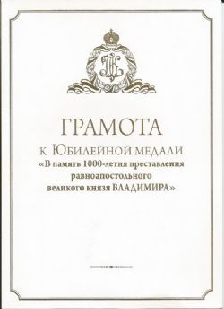 Раисе Михайловне Бауковой, учителю истории МОУ СОШ № 19 «Выбор» п. Врангель (Находкинская епархия), была вручена Патриаршая юбилейная медаль "В память 1000-летия преставления равноапостольного великого князя Владимира ".