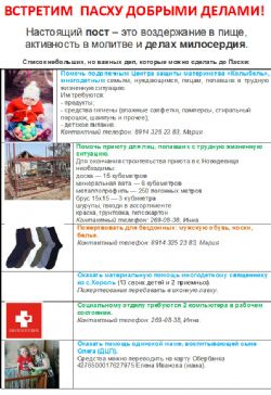 - Акция "Встретим Пасху добрыми делами" закончилась, но в Покровском кафедральном соборе г.Владивостока (Океанский проспект, 44) и сейчас стоит корзина для сбора пасхальных подарков. Любому подарку - пачке памперсов или печенья, карандашам или игрушке будут рады в многодетных семья, малоимущие, подопечных Центра защиты материнства «Колыбель», дети из социальных учреждений.