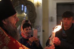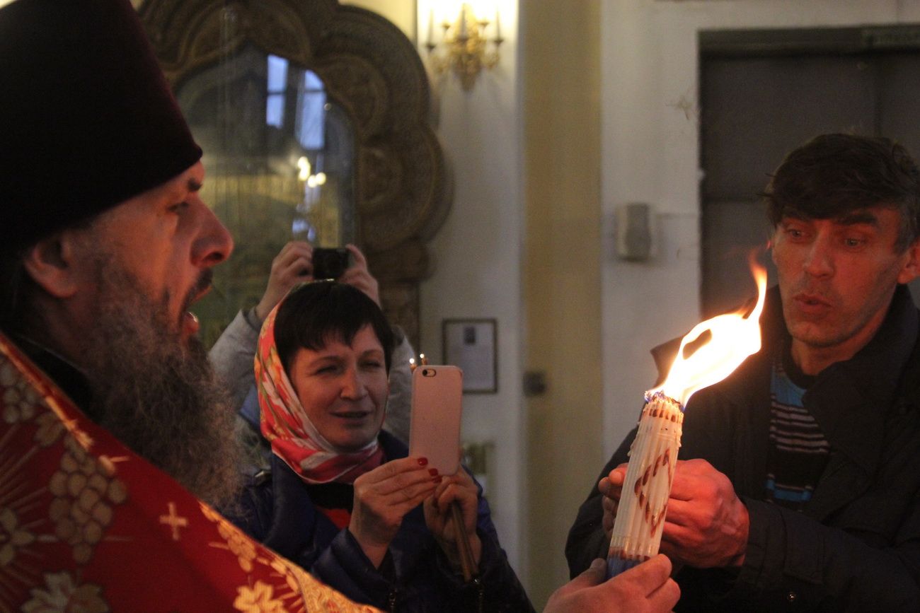 Свечи и лампады в соборе были затушены, а вновь их зажгли уже от Благодатного огня. Частичку великой святыни смогли унести домой все прихожане.
