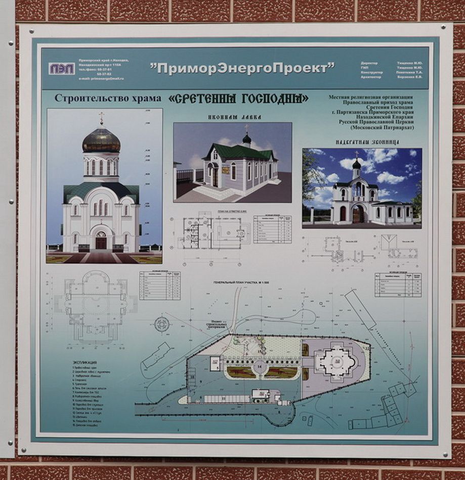 Храм Сретения Господня существует пока в проекте, приход собирается в маленьком приспособленном помещении временного храма. Главное, что есть приход и постоянная молитва.