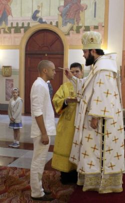 На малом входе владыка Антоний возложил на иерея Феодора Кима наперсный крест, права ношения которого священник был удостоен указом Святейшего Патриарха Московского и всея Руси Кирилла.