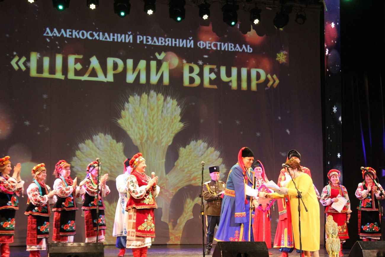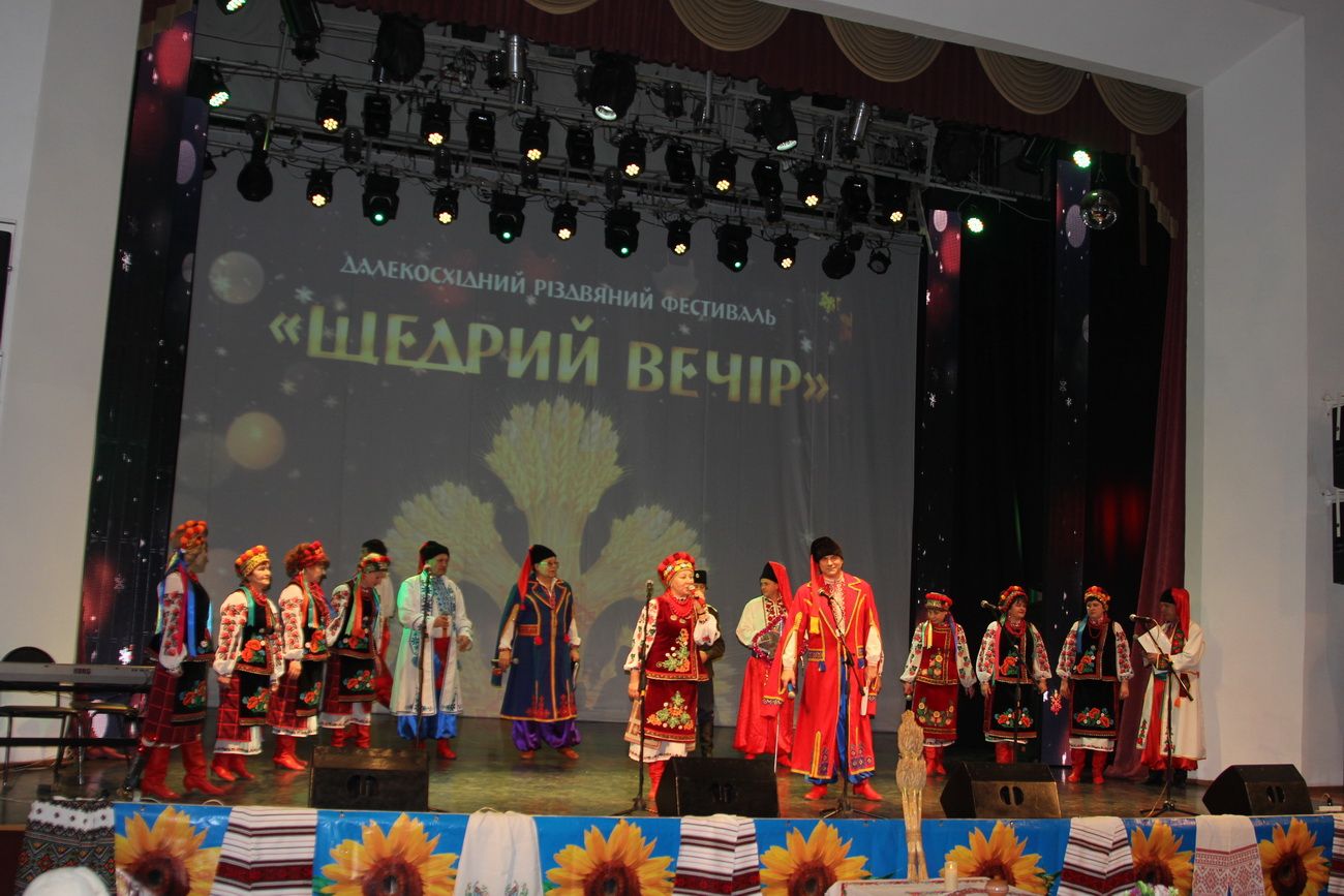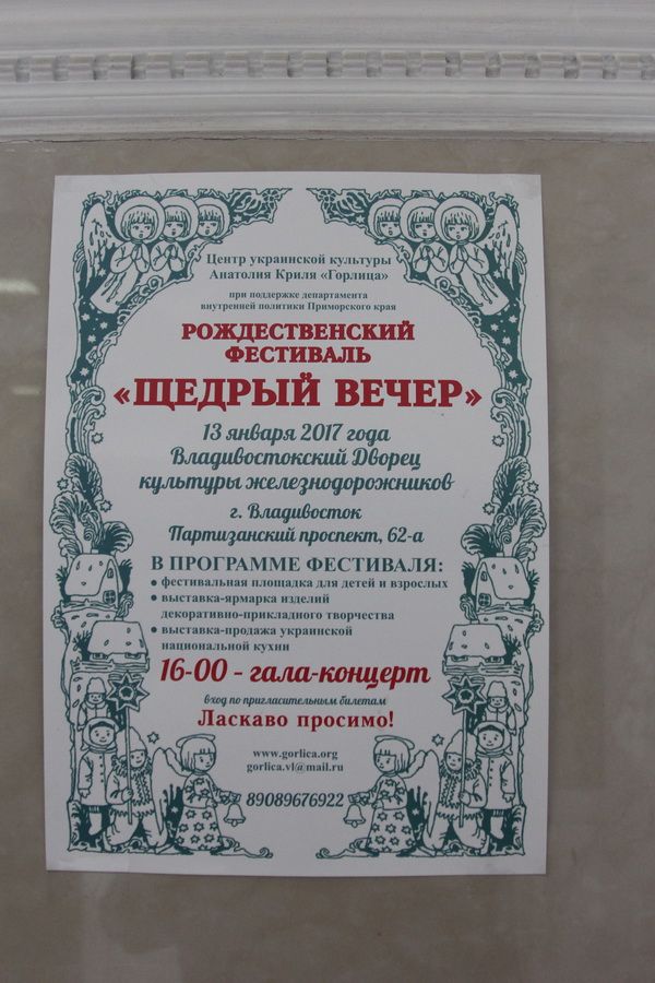 Владивосток. 13 января 2017 года во Дворце культуры железнодорожников прошёл Рождественский фестиваль украинской культуры «Щедрый вечер». Одиннадцатый раз собрались на Святки более 250 артистов со всего Приморья, в основном – дети и молодёжь. До начала гостей в фойе встречала выставка декоративно-прикладного творчества, в том числе и работы учеников воскресных школ православных приходов Владивостока, а так же разнообразные творческие мастерские по изготовлению сувениров.