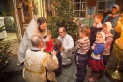 Не остались без внимания и дети детского сада «Росинка» села Спасского. Малыши пришли послушать рассказ о Младенце-Христе. Об этом им поведала педагог храма Вознесения Господня Ирина Карайбеда: "Дошколята немного иначе воспринимают информацию чем взрослые, для них очень важна наглядная «живая» картинка. В Воскресной школе нашего храма в подготовительной группе обучаются дети с пяти лет, поэтому у педагогов накоплен опыт общения с малышами. В этом году трудами настоятеля нашего храма митрофорного протоиерея Владимира Капитанюка во дворе для малышей было много интересного. Это и ледяная скульптура-вертеп с ледяными ангелами, и нарядные ёлочки. И снежная пещера-вертеп, где на соломе расположились деревянные фигуры младенца Христа в яслях и Девы Марии с Иосифом".