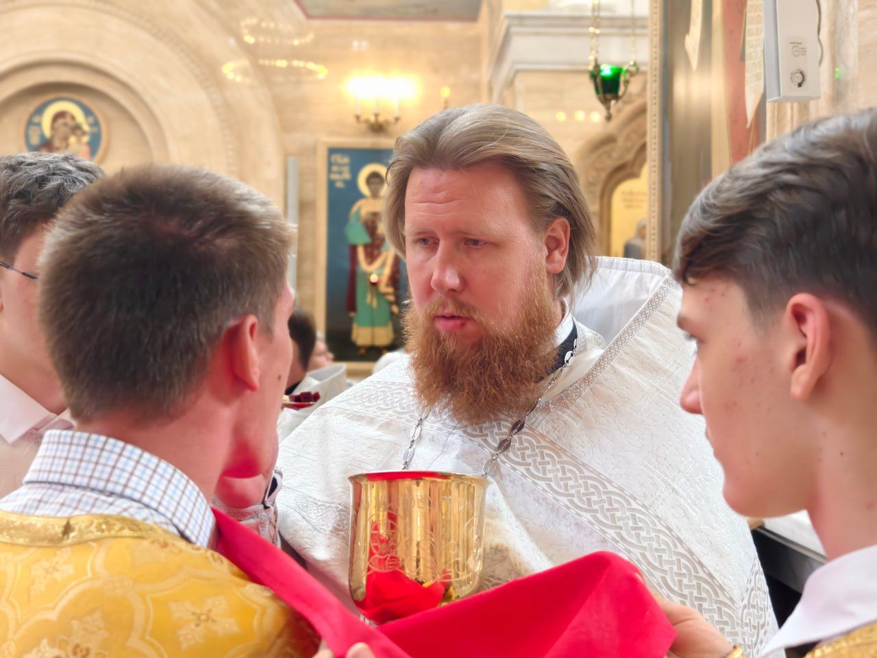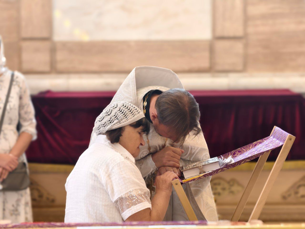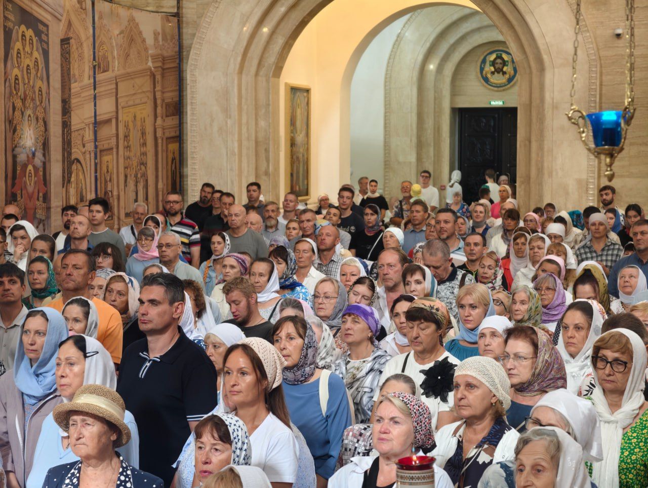 Сегодня кафедральный собор был наполнен молящимися. Алтарь и иконы собора украшены белыми цветами, что наряду с белыми сияющими облачениями священства символизирует фаворский свет, исходящий от Преобразившегося Спасителя. Многие прихожане тоже выразили своё почитание праздника белым цветом одежд и головных уборов.