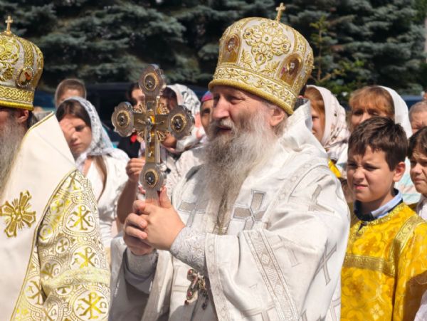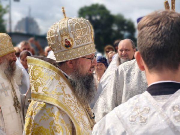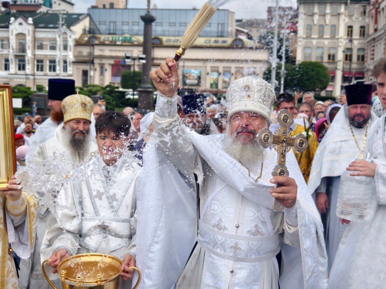 По окончании литургии архиереи, духовенство и верующие вышли на праздничный крестных ход. Под перезвон колоколов и молитвенное пение крестоходцы обошли вокруг собора. На остановках читалось Евангелие, а верующих окропляли святой водой.