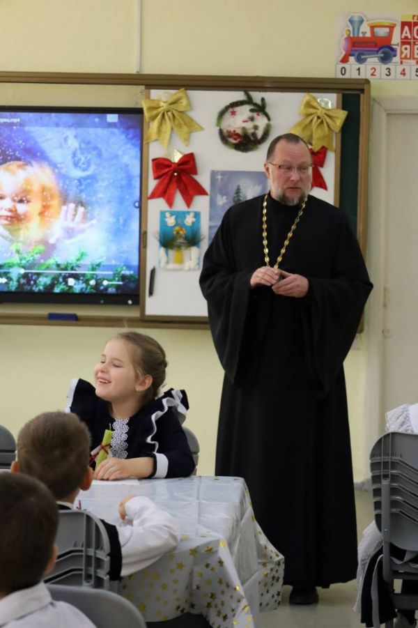 18 декабря иерей Александр Казанцев, настоятель храма Успения Пресвятой Богородицы п. Тавричанка, побывал в МБОУ СОШ №4 имени В.Н. Косова. Батюшка посетил праздник, посвящённый дню памяти свт. Николая Чудотворца. На мероприятии присутствовали директор школы, ученики 1-х и 5-х классов и их родители.