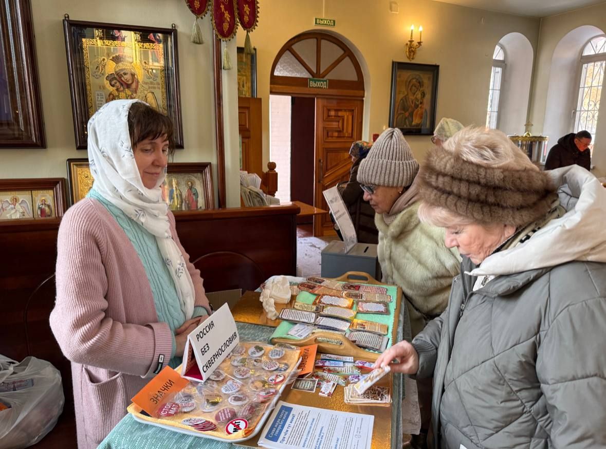 Затем социальная служба храма организовала благотворительную ярмарку, на которой бесплатно раздавали иконы с молитвами, православные календари и разнообразную печатную продукцию. В рамках акции «Россия без сквернословия» прихожанам и гостям были предложены значки и магнитики, призывающие к чистоте русской речи, что стало уже традицией прихода.