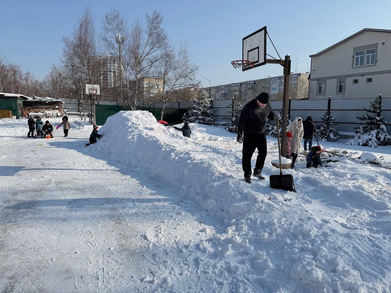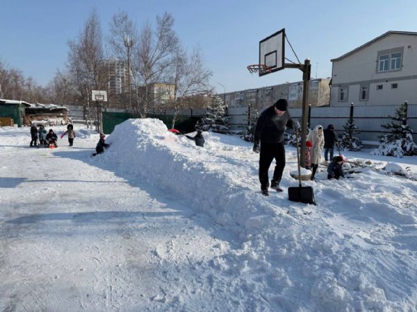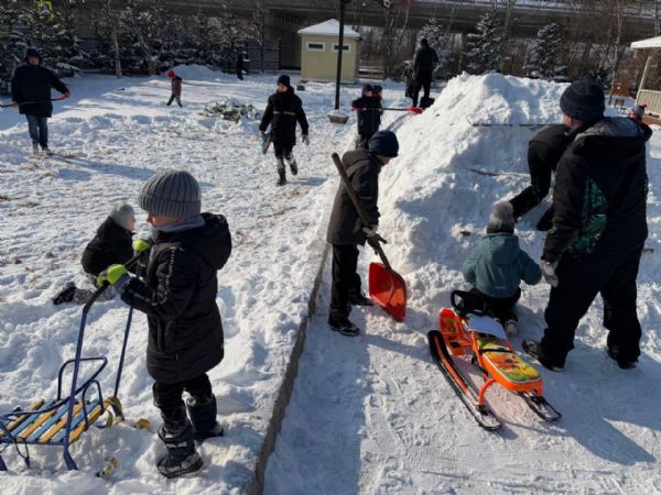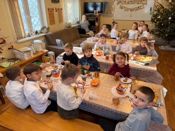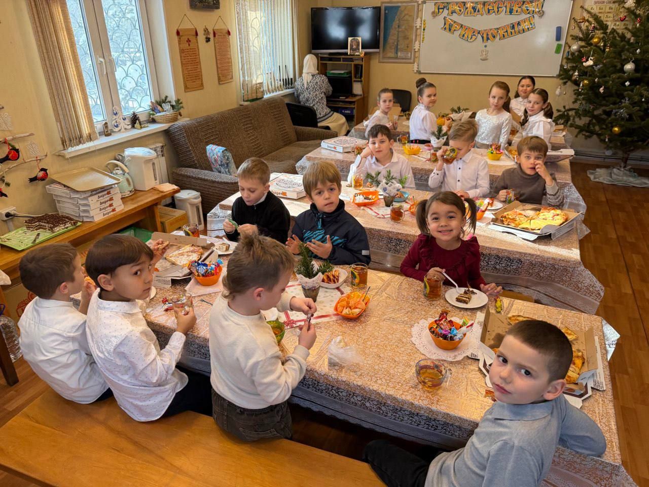 После совместного фотографирования все присутствующие отправились на чаепитие. Пока мамы вместе с детьми трапезничали, папы дружно построили снежную горку на территории храма. Праздник продолжился на улице: радостные ребятишки под задорный смех прокатились с новенькой горки.