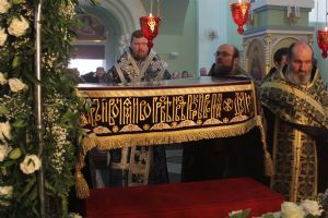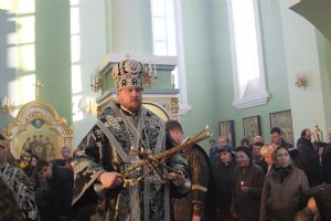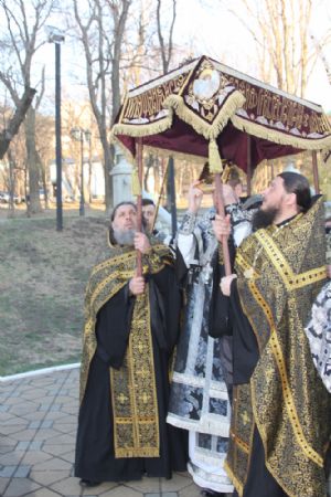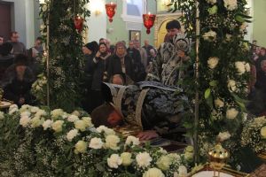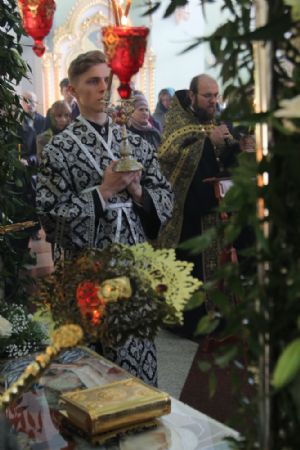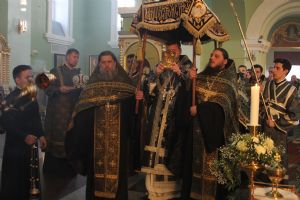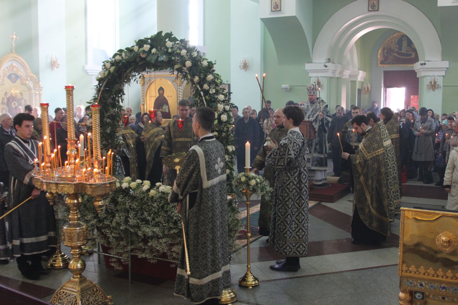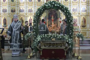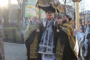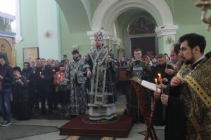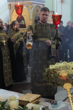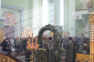Его Высокопреосвященству сослужили: ключарь собора протоиерей Александр Талько, протоиерей Константин Чунчук, игумен Тихон (Иршенко), протоиерей Игорь Шевчук, иерей Максим Точуков, иерей Владимир Брагин.