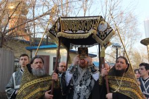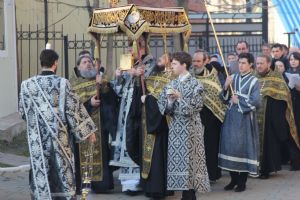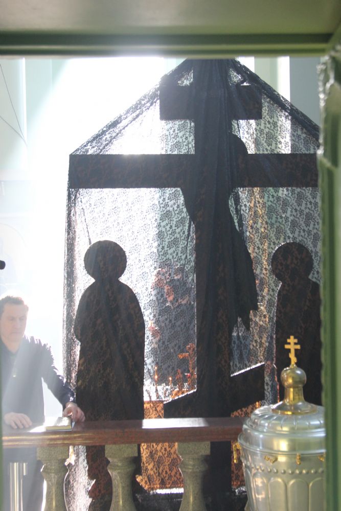 В конце Великого славословия митрополит Владимир, духовенство и прихожане под пение заупокойного «Святый Боже, Святый Крепкий, Святый Безсмертный, помилуй нас…», крестным ходом обнесли Плащаницу вокруг собора и возвратились в храм. Перед Плащаницей было прочитано Евангелие о запечатании гроба Господня и приставлении к нему стражи.
