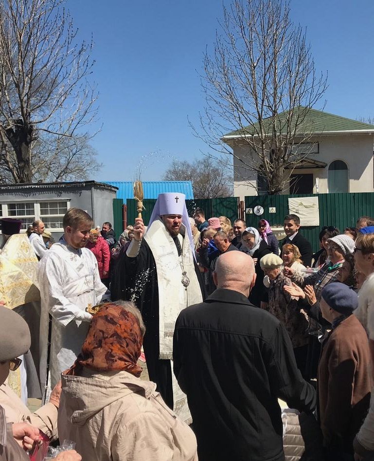 В завершение богослужения митрополит Владимир обратился к верующим с архипастырским словом и совершил освящение пасхальной снеди.