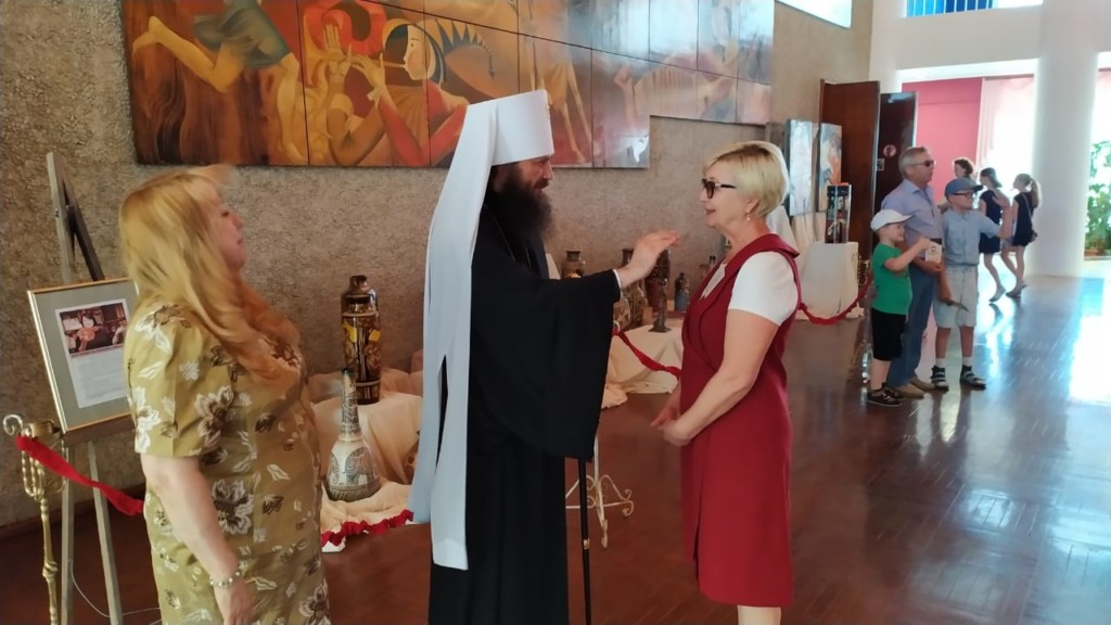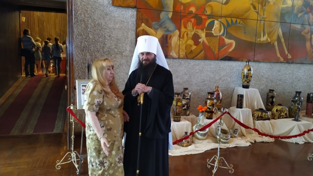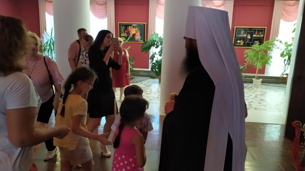 Митрополит Феодор ознакомился с конкурсными работами, выставленными в фойе, благословил гостей праздника и побеседовал с его организаторами.