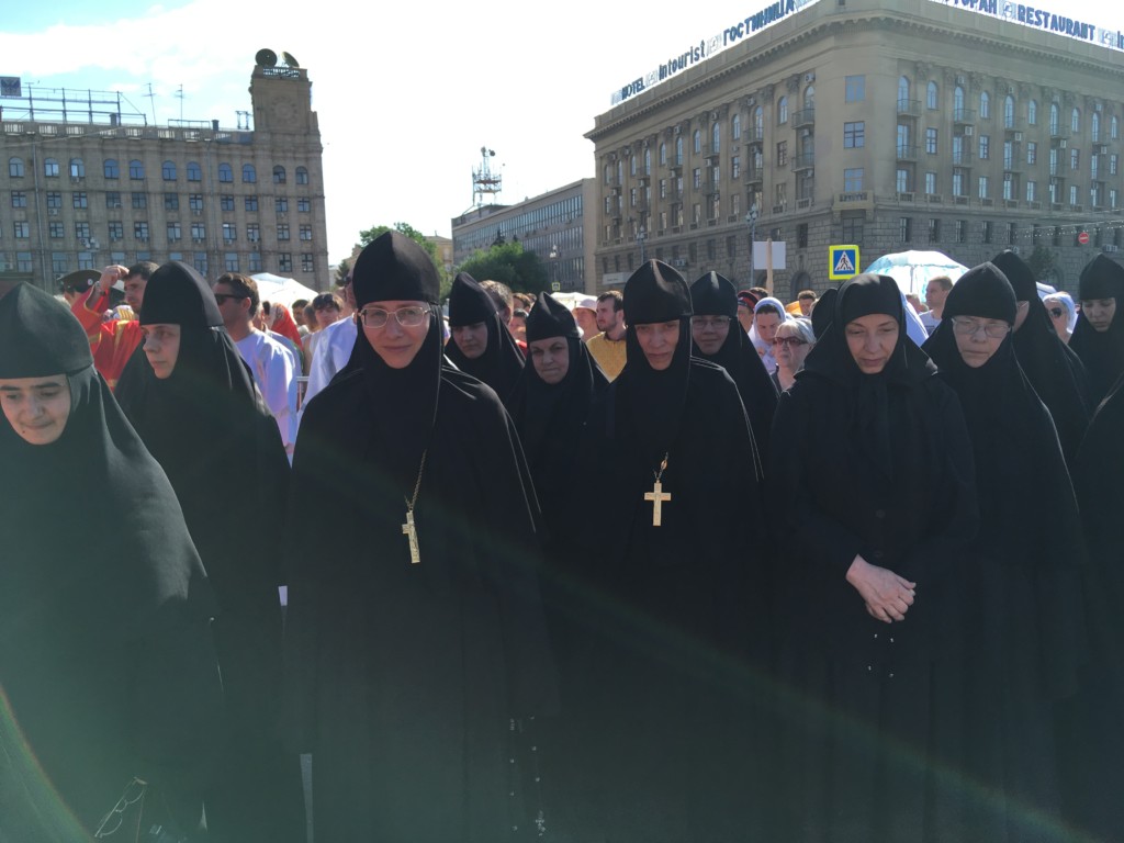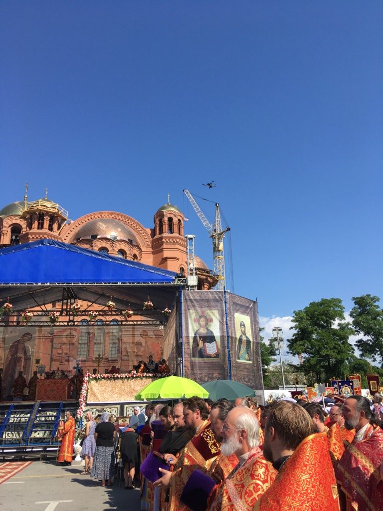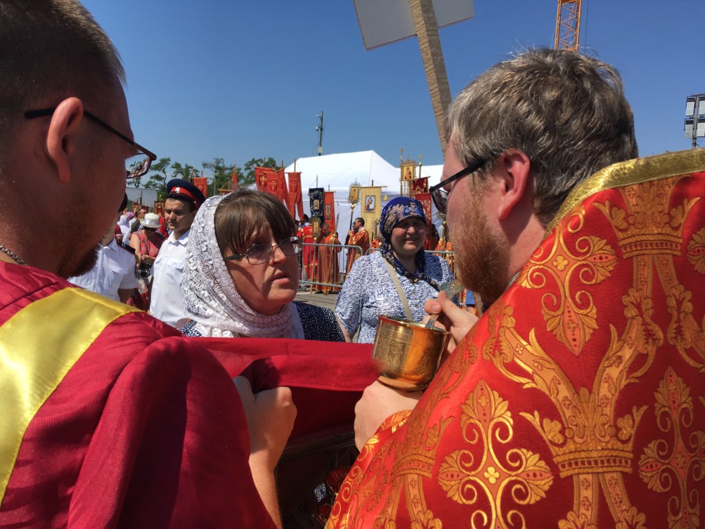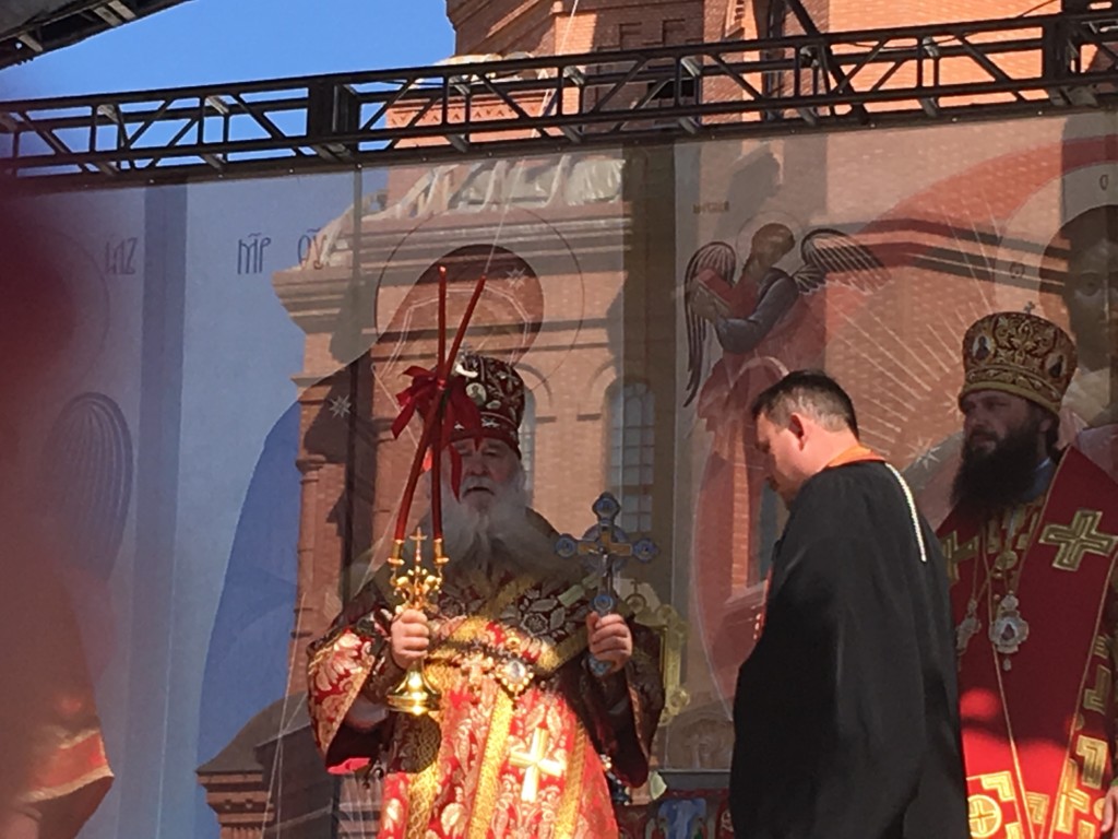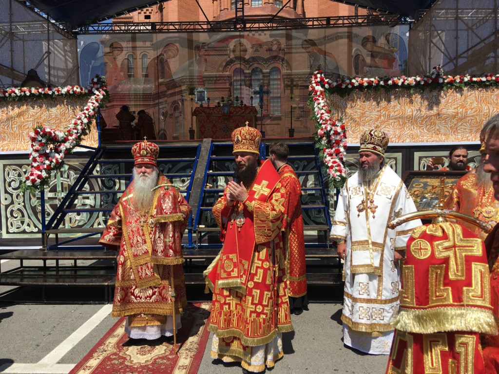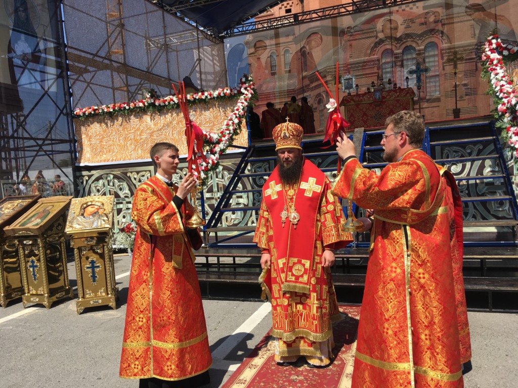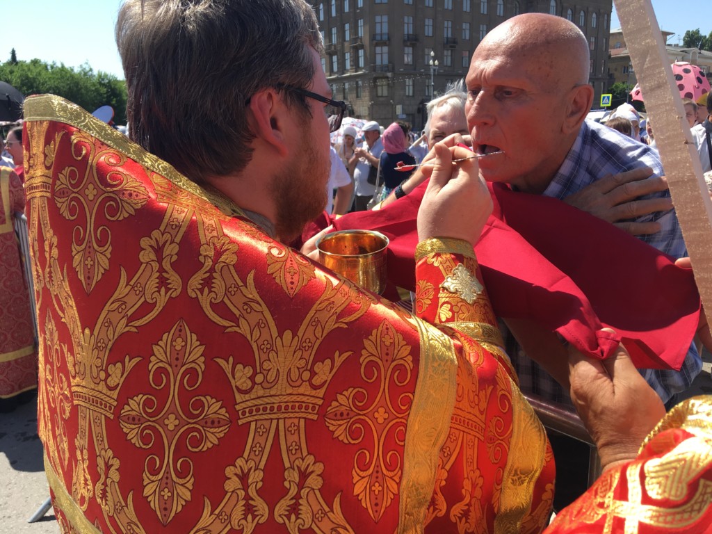 Здесь перед строящимся собором Александра Невского состоялась Божественная литургия. Совершили ее митрополит Герман (Тимофеев), митрополит Волгоградский и Камышинский Феодор, архиепископ Элистинский и Калмыцкий Юстиниан, архиепископ Бакинский и Азербайджанский Александр, епископ Рыбинский и Даниловский Вениамин, епископ Урюпинский и Новоаннинский Елисей, епископ Городецкий и Ветлужский Августин, епископ Калачевский и Палласовский Иоанн, духовенство Волгоградской митрополии в количестве 140 человек. Вместе с ними молились игумении женских обителей. На площади также присутствовали представители власти, представители казачьих обществ, православных молодежных объединений, верующие всех приходов Волгоградской митрополии. Причастие совершалось из десяти чаш. Причаститься смогли сотни верующих.