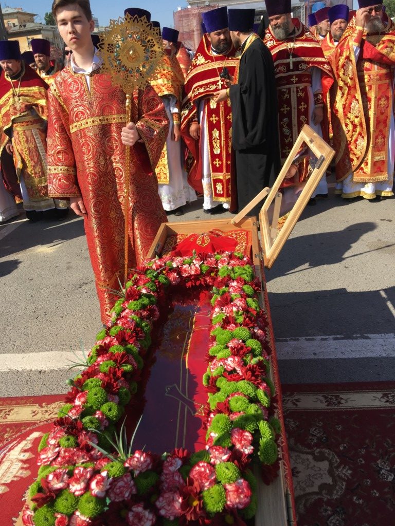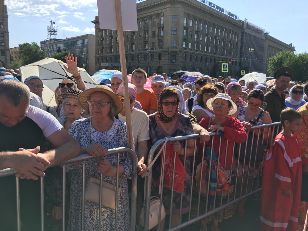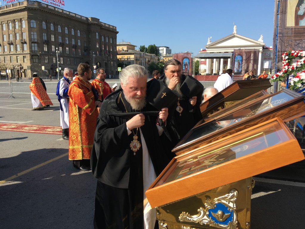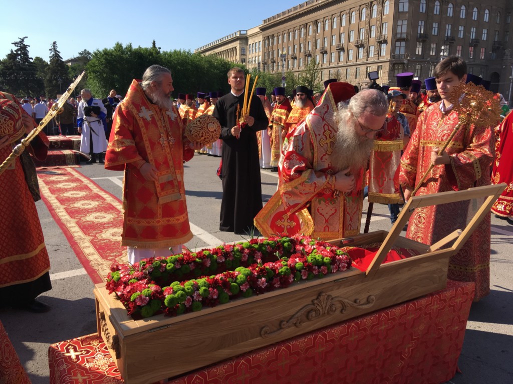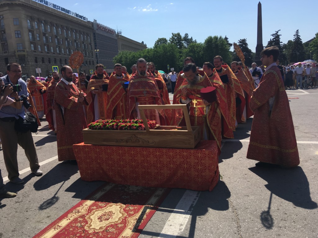 Во время крестного хода, в котором приняли участие сотни волгоградцев, верующие пронесли раку с мощами до площади Павщих Борцов в центре Волгограда и установили на специальном помосте, чтоб все верующие могли приложиться.