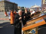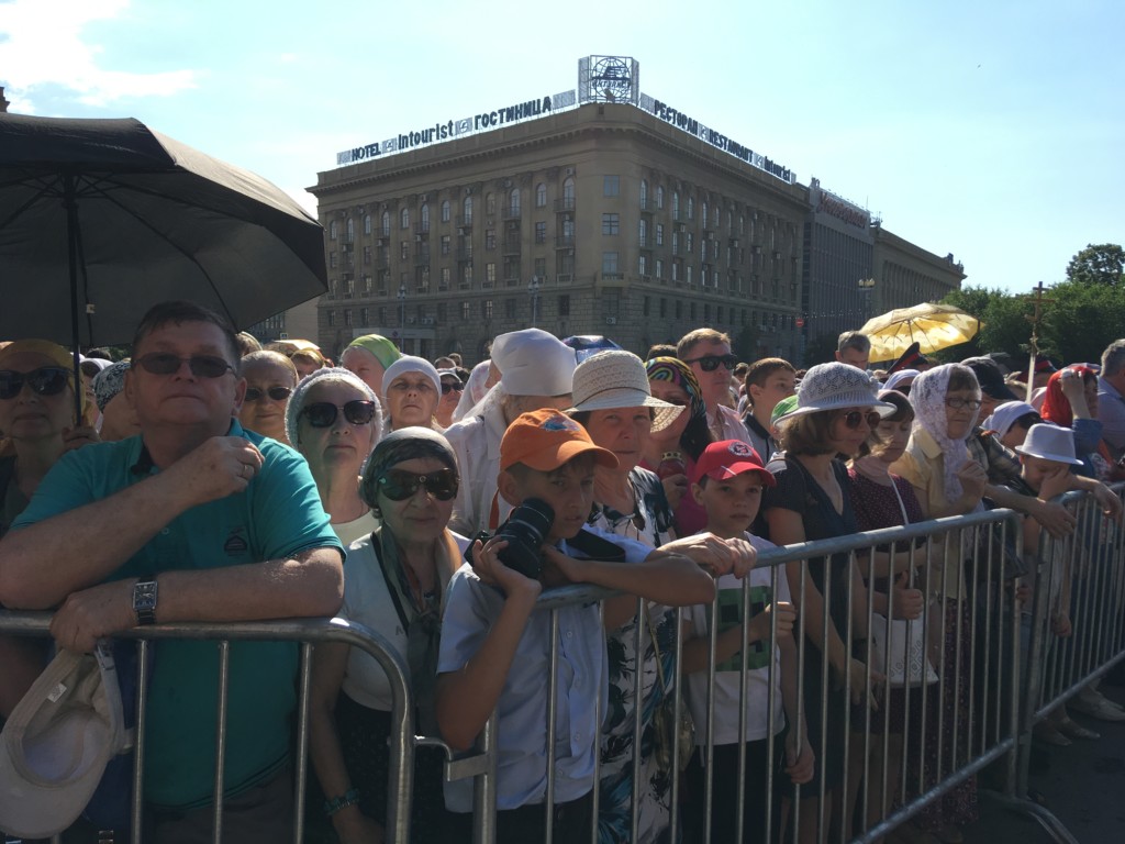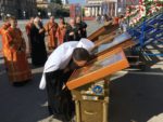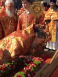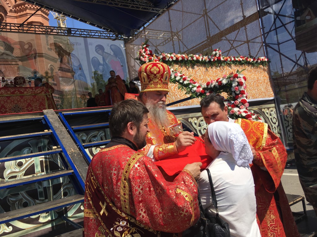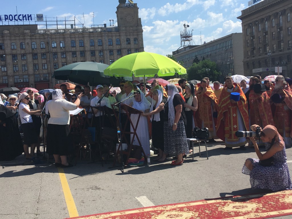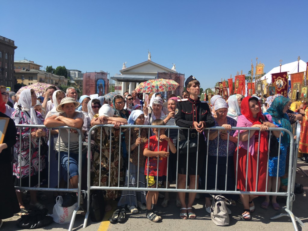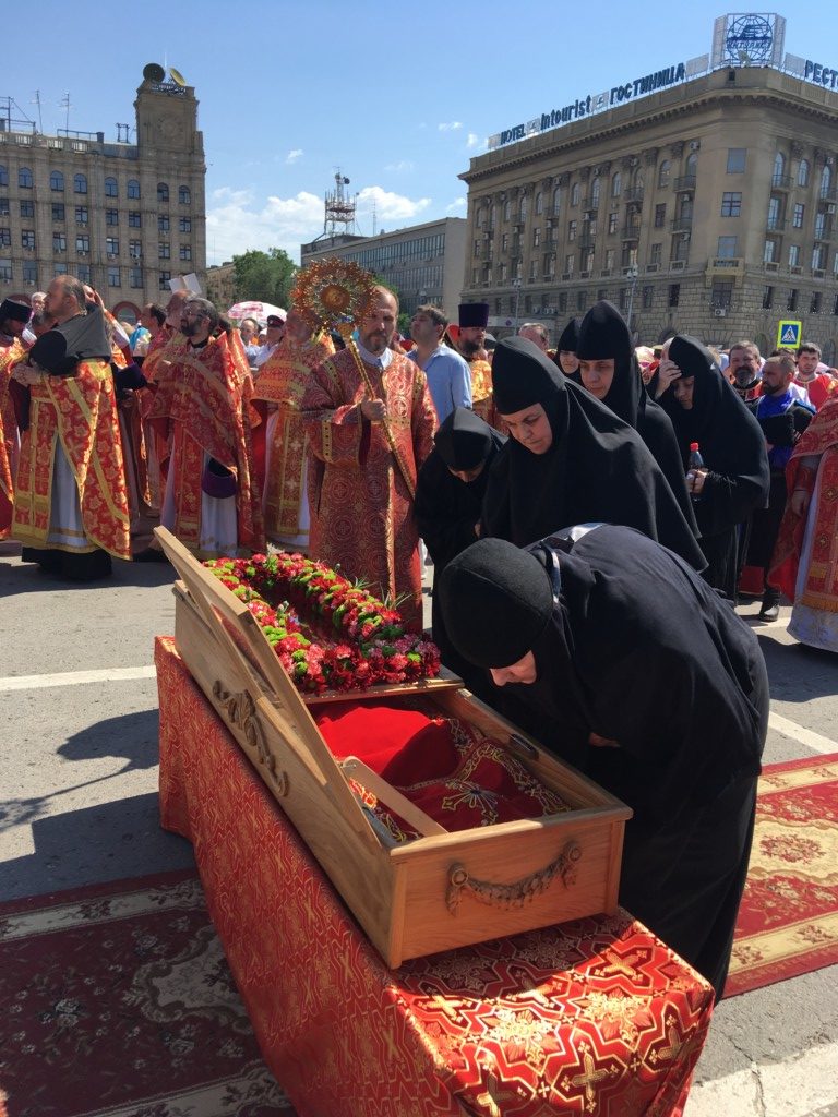 Во время крестного хода, в котором приняли участие сотни волгоградцев, верующие пронесли раку с мощами до площади Павщих Борцов в центре Волгограда и установили на специальном помосте, чтоб все верующие могли приложиться.