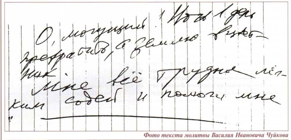 Уже после кончины Чуйкова в его архиве, среди личных документов маршала — рядом с паспортом и военным билетом — была обнаружена его личная молитва, время написания которой не известно: «О, Могущий ночь в день превратить, а землю в цветник. Мне все трудное легким содей и помоги мне».