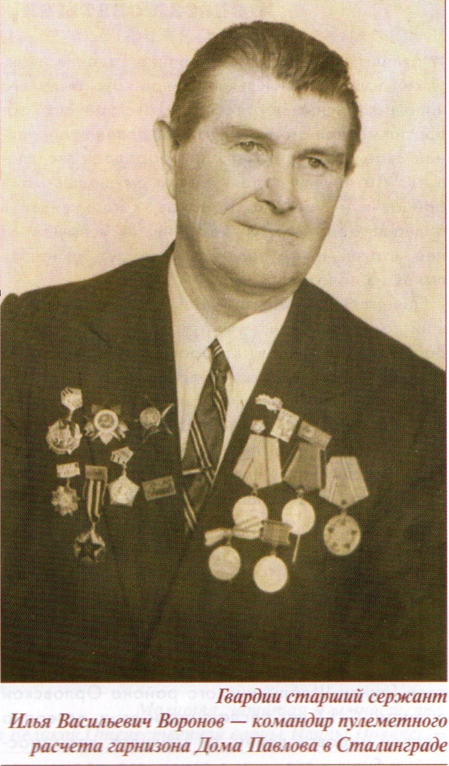 Единственный защитник Дома Павлова, доживший до наших дней, — виртуоз-пулеметчик Илья Васильевич Воронов, которого очень любил генерал Родимцев (тоже великолепный пулеметчик), был душой этого героического гарнизона. Ростом под метр девяносто с пудовыми кулаками, он мог выбрать и самую лучшую огневую позицию для своего пулемета, и песню о пулемете сочинить, и старших по званию мудро и тактично в нужный момент увещевать. «Яша, если будет трудно, я у мельницы», — сказал он Павлову перед походом того в дом. Тогда пулемет Воронова работал у той самой мельницы, каркас которой до сих пор стоит в Волгограде напоминанием о Сталинградской битве.