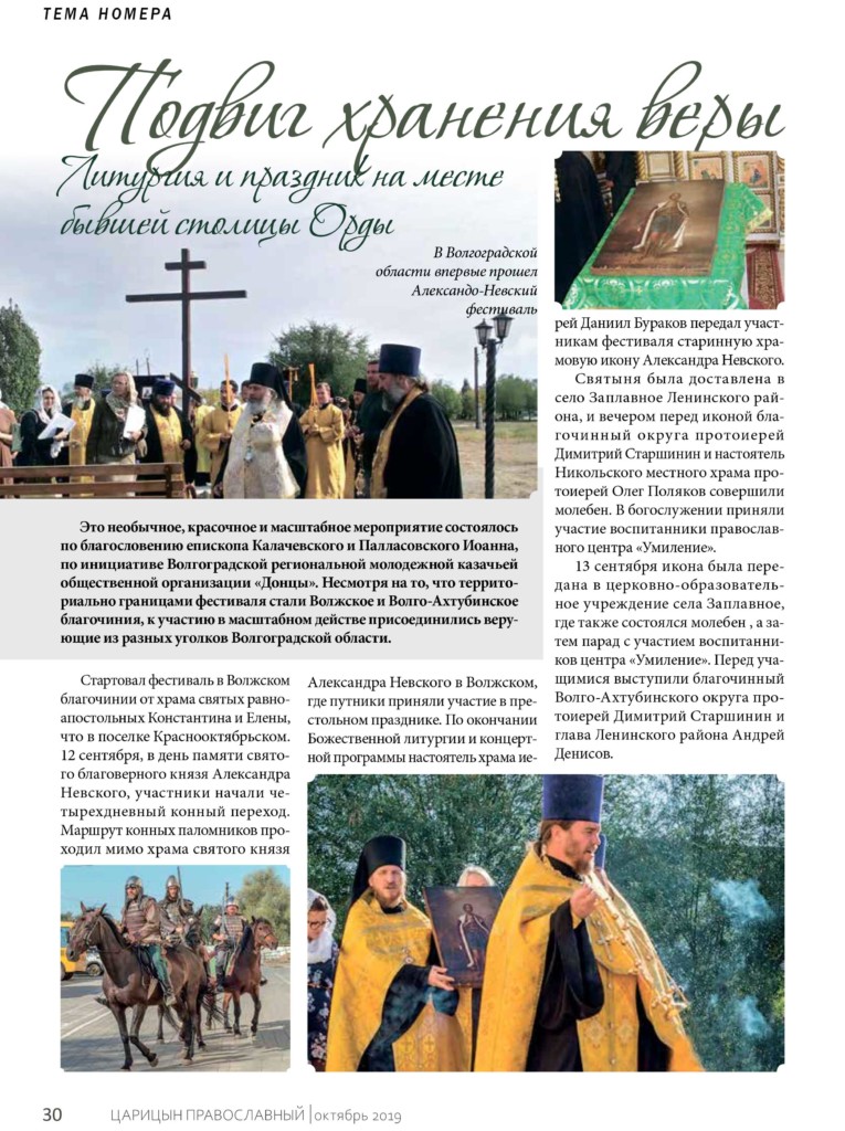 От репортажа с Площади Павших борцов, где прошел грандиозный праздник, посвященный памяти святого князя Александра Невского и первому в истории дню всех святых, в земле волгоградской просиявших до рассказа с места бывшей столицы Золотой Орды, где в тот же день состоялись литургия, молебен и первый в нашей области Александро-Невский фестиваль . Сквозной нитью проходит тема ежедневного незримого подвига православного священства, в любых условиях несущего свою небесно-земную службу. И не только священства. Среди сегодняшних подвижников немало скромных прихожан, учителей воскресных школ, певчих, обычных горожан, так или иначе служащих Господу своими дарами. «Чувство единой церкви, земной и небесной» — этот заголовок статьи священника Сергия Мотовилина вполне можно было бы поставить эпиграфом ко всему журналу.