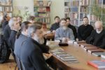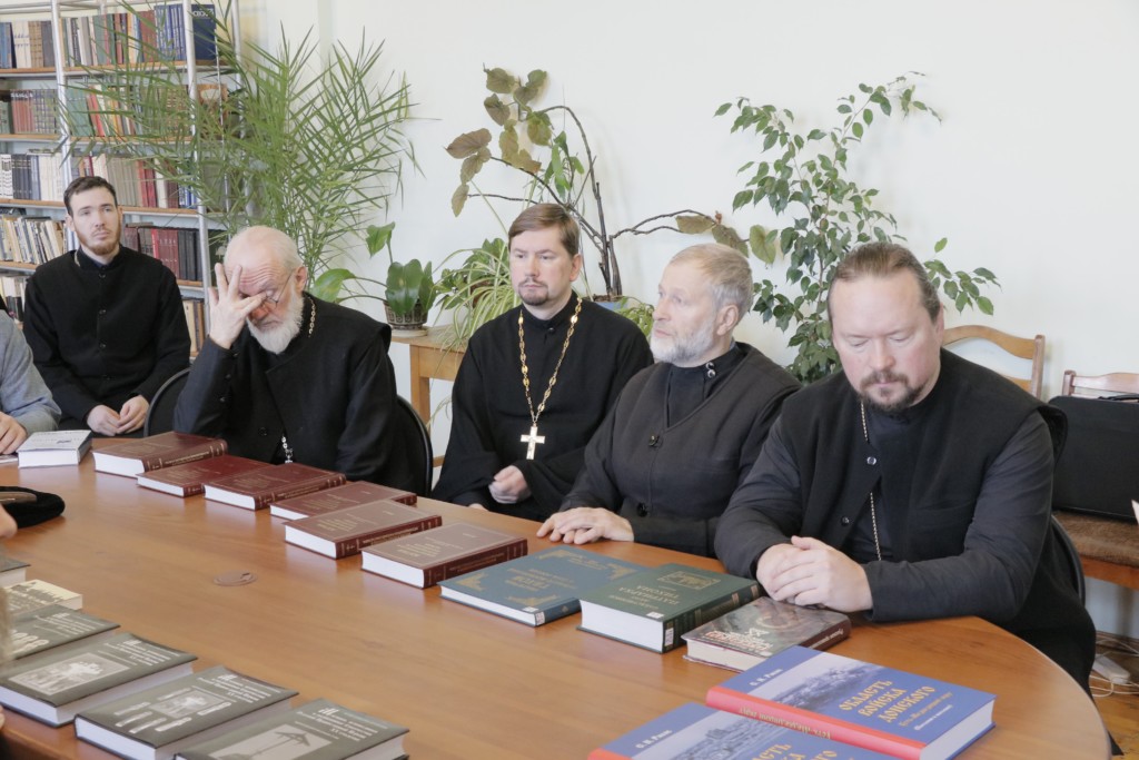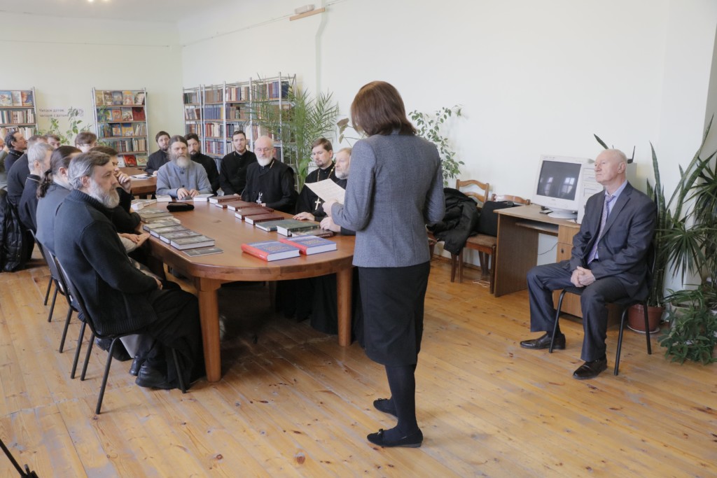 В библиотеке Царицынского православного университета в рамках курса повышения квалификации для клириков с духовенством Волгоградской митрополии встретился доктор исторических наук, профессор Сергей Рябов. Организатором выступили преподаватель Центра подготовки церковных специалистов, кандидат богословия иеромонах Климент (Наумов) и заведующая библиотекой Марина Шелест.