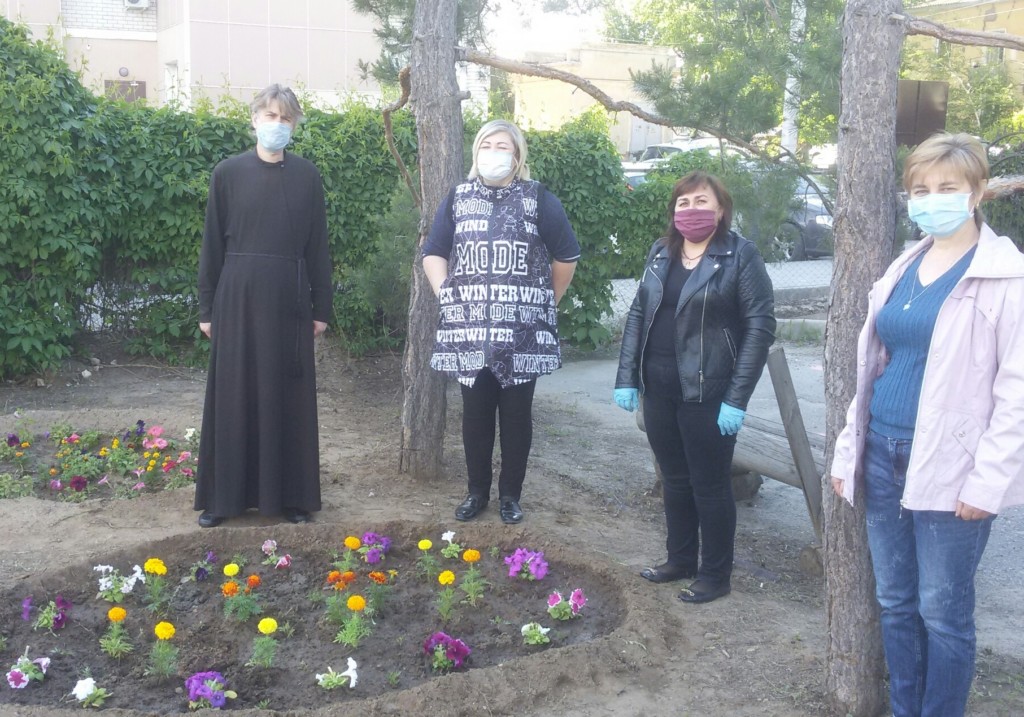 Работники детских садов Ворошиловского района Волгограда приняли участие в благоустройстве и озеленении территории прихода храма «Крестовоздвиженский» на ТЮЗе.