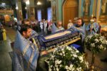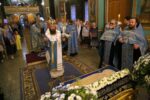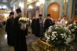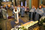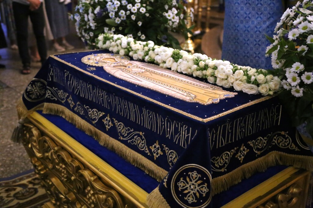 Во время утрени из алтаря на середину храма была вынесена Плащаница Божией Матери.