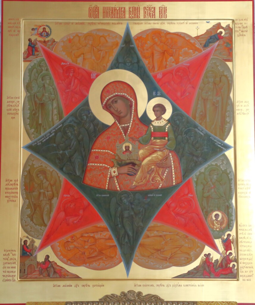 Богоматерь собрала вокруг Предвечного Младенца весь мир — силы земные и Небесные. Именно такой, собранной воедино, и замыслил Вселенную Бог в Своей Премудрости, именно ею должны быть побеждены хаотические, центробежные силы смерти и распада. Тем самым подле Купины возникает и иной образ — образ Софии, Божественной воли, предвечного замысла Творца о творении.